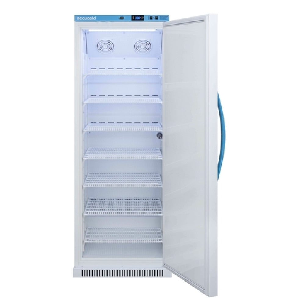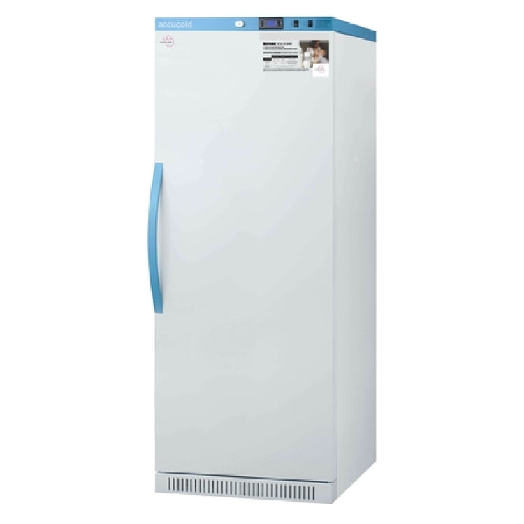 The Summit MLRS12MC Accucold MOMCUBE™ Breast Milk Refrigerator is a sophisticated refrigeration solution tailored for the precise needs of storing breast milk, with a compact one-section design measuring 23-3/8 inches in width. This refrigerator offers a generous 12 cubic feet of storage space, maintaining a preset temperature range of 33 to 40°F to ensure optimal milk preservation. Equipped with a single solid hinged door featuring a secure lock, it provides peace of mind in safeguarding valuable contents. The interior is illuminated with LED lighting, aiding visibility, and includes seven adjustable wire shelves for customizable organization. The unit utilizes automatic defrost technology and is powered by a robust digital thermostat, supported by two internal fans for consistent air distribution. Thoughtfully designed with temperature, open door, and power outage alarms, it excels in safety and reliability. Its exterior sports a sleek white finish, while the bottom mount self-contained refrigeration system utilizes R600a Hydrocarbon refrigerant, making it an environmentally conscious choice. Operating at 115V/60 Hz and drawing 1.4 amps, this model carries ETL and cETL (Medical) certifications, underscoring its suitability for healthcare settings where the preservation of breast milk is critical.