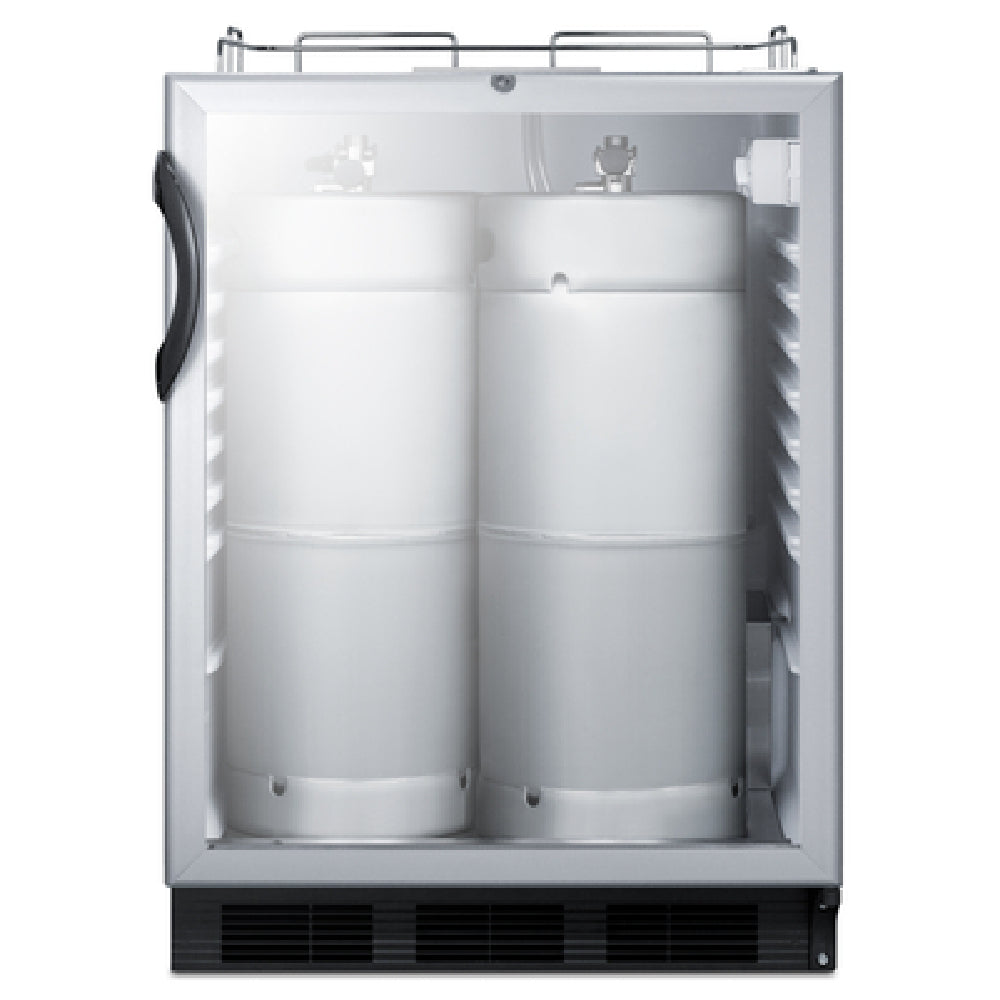 The Summit SBC56GBINKADA Draft Beer Cooler Dispenser is an advanced solution for those seeking a versatile and efficient beer cooling system. With its ADA-compliant counter height, this unit is suitable for both built-in and freestanding applications, catering to a variety of commercial and residential needs. Measuring 24 inches in width, it boasts a 5.5 cubic foot capacity, capable of accommodating two 1/6 kegs. The dial thermostat offers a temperature range of +34°F to +43°F, ensuring optimal storage conditions for draft beer. An automatic defrost function contributes to ease of maintenance, while the front-breathing design allows for flexible placement. Featuring a stainless steel guard rail and a removable drip tray, the dispenser is designed for practicality and hygiene. The reversible right-hinged locking glass door, along with an interior light, provides both security and visibility. The black cabinet is complemented by a seamless interior liner with a stainless steel floor cover, enhancing durability. Powered by a self-contained bottom-mounted compressor utilizing R600a Hydrocarbon refrigerant, it operates on 115v/60/1-ph at 1.8 amps. Certified by cETLus and ETL-Sanitation, the Summit SBC56GBINKADA Draft Beer Cooler Dispenser is a reliable choice for those seeking high standards in beverage storage solutions.
