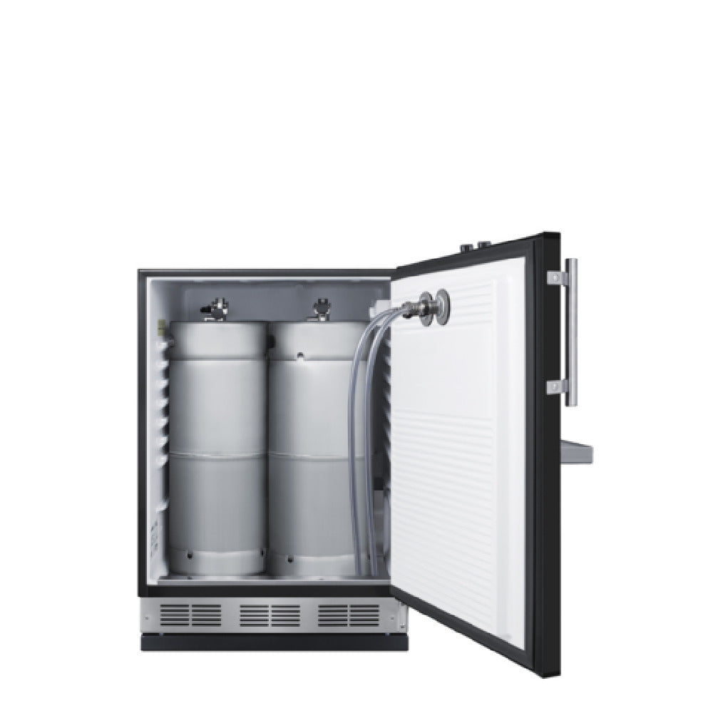 The Summit SBC58BFRTP Front Tap Built-In Beer Kegerator is a versatile and compact unit designed for seamless integration into any indoor space without requiring countertop alterations. Measuring 24 inches in width and offering an adjustable height ranging from 33.5 to 34.5 inches, it fits snugly into various settings while providing substantial 5.3 cubic feet of capacity. This kegerator comes with a black cabinet and door, and features a factory reversible right-handed swing door for flexible installation options. The interior is outfitted in white and includes a reliable 5 lb. CO2 tank with a regulator, dual front tap, and Sankey American tap, along with necessary connection hardware. It is designed to accommodate two 1/6 (sixtel) sized kegs and includes an interior tank holder, stainless steel drip tray, and floor cover. The unit also features an interior light with a rocker switch, an adjustable dial thermostat, and automatic defrosting technology. Operating with R600a refrigerant, it is 100% CFC free and CARB compliant, supporting environmental standards. This kegerator meets ETL, ETL-C, and ETL-S certifications for both residential and commercial use. Proudly made in Europe and the USA, the Summit SBC58BFRTP is a freestanding unit designed for efficiency and ease of use with 115V/60 Hz power requirements.
