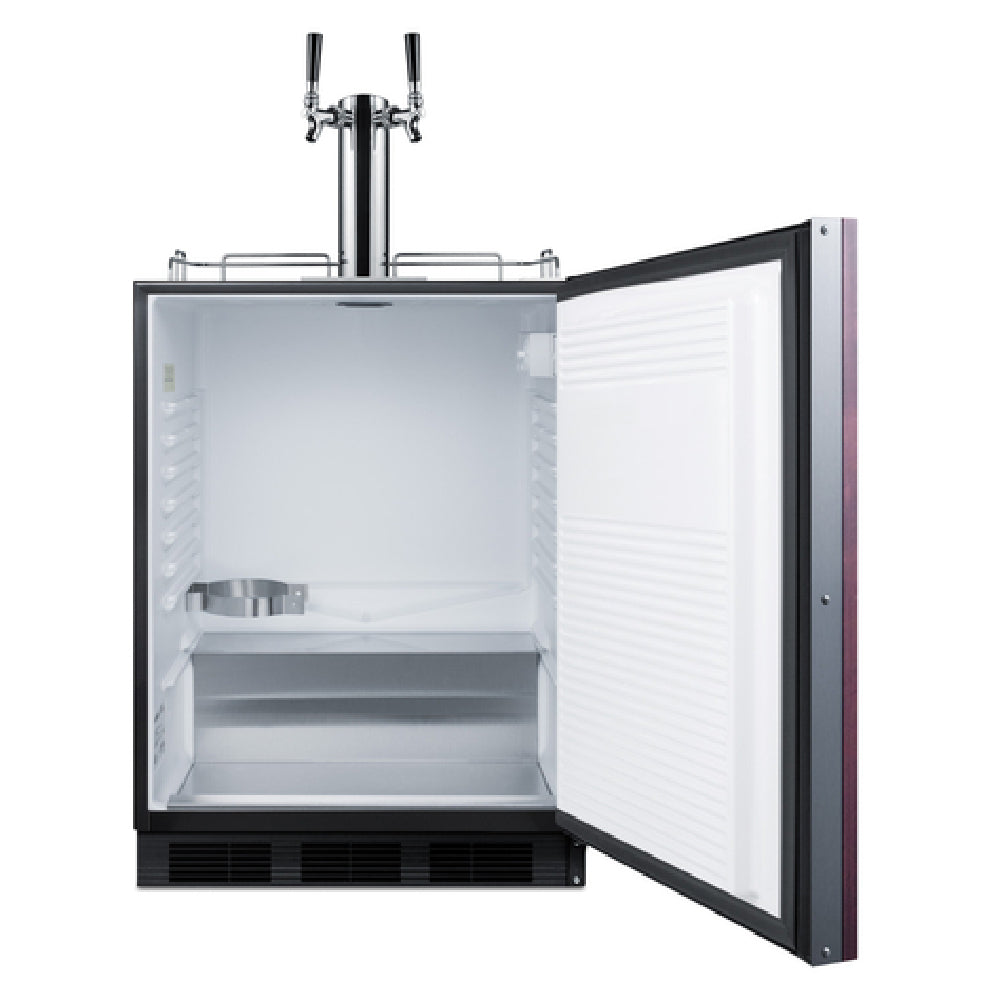The Summit SBC58BLBIADAIF Draft Beer Cooler Dispenser is a meticulously engineered unit designed to meet ADA compliance for counter height installations, suitable for both built-in and freestanding applications. With a compact width of 24 inches and a generous 5.5 cu. ft. capacity, this cooler can accommodate two 1/6 kegs, making it a versatile choice for small to medium-scale beverage service environments. The unit features a dial thermostat with a temperature range from +34°F to +43°F, ensuring optimal beer storage conditions. It is equipped with a front-breathing design and a self-contained bottom-mounted compressor, utilizing R600a Hydrocarbon refrigerant for energy-efficient cooling. The dispenser includes a Sankey American tap kit, connection hardware, a cleaning kit, and a dual draft tower, all complemented by a 5 lb. CO2 tank and regulator. The black cabinet houses a seamless interior liner with a stainless steel floor cover and a removable stainless steel drip tray for easy maintenance. The unit also features a factory-reversible right-hinged panel-ready door, allowing for customization with your choice of overlay. Certified by cETLus and ETL-Sanitation, this cooler is a robust and reliable asset for any venue seeking quality draft beer dispensing solutions with ADA compliance.