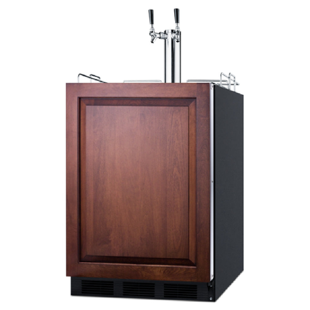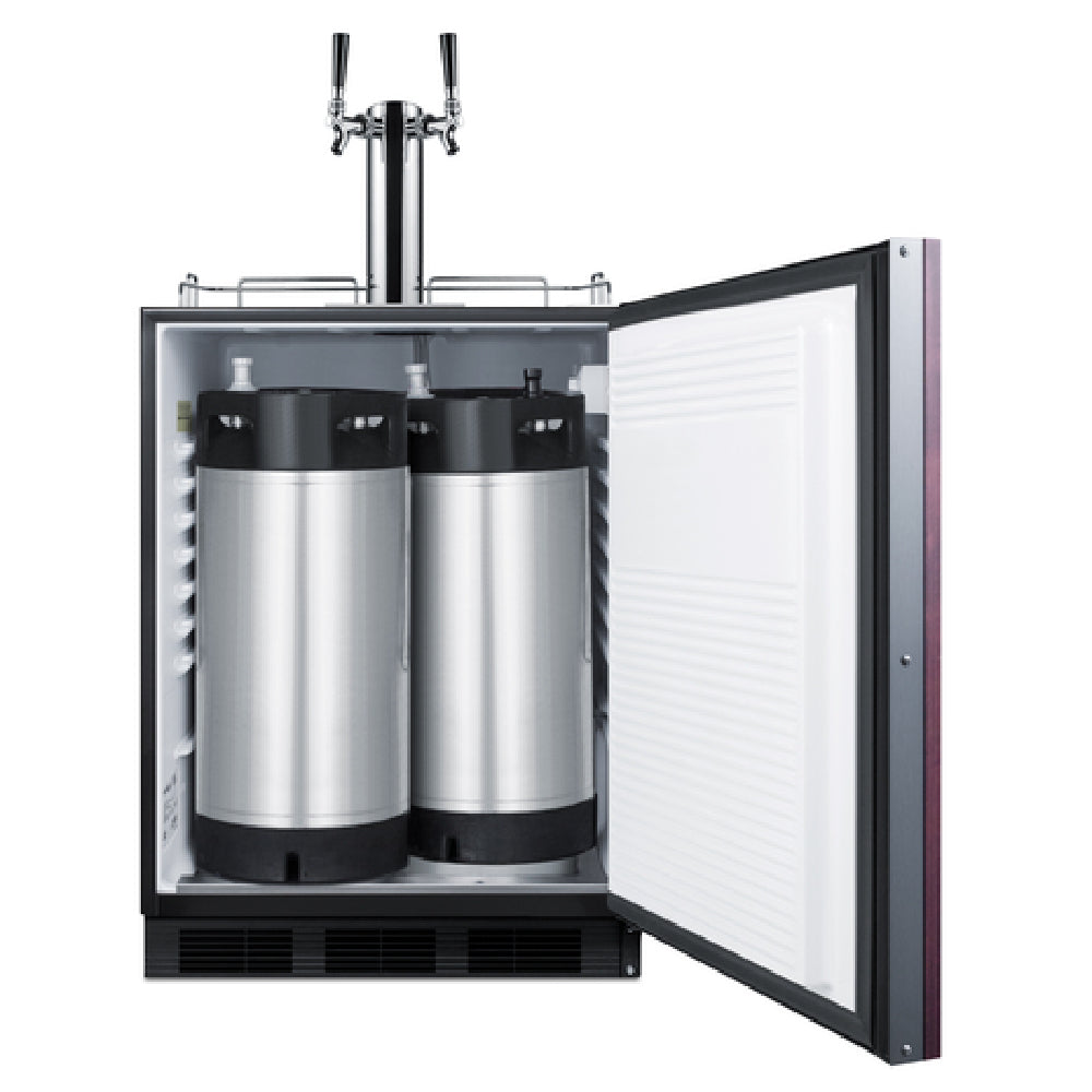 The Summit SBC58BLBIADAIFCFTWIN Cold Brew Coffee Dispenser is a versatile unit designed for ADA compliance, suitable for both built-in or freestanding use, with an innovative design tailored for commercial environments. This dispenser, measuring 24 inches in width, offers a spacious 5.5 cubic feet capacity, accommodating two Cornelius kegs. The temperature range is meticulously controlled between +34°F to +43°F via a dial thermostat, ensuring optimal freshness of cold brews. Featuring an automatic defrost system, it alleviates maintenance burdens. The dispenser includes a commercial-grade tap kit complete with a nitrogen tank, dual tap stainless steel draft tower, regulator, and ball lock connections, which ensure seamless beverage dispensing. A stainless steel guard rail, removable drip tray, and a factory reversible right-hinged panel-ready door enhance its functionality. The interior is illuminated and the exterior fan is designed to maintain efficiency, while a seamless interior liner with a stainless steel floor cover provides durability. The black cabinet houses an R600a Hydrocarbon refrigerant system, backed by certifications such as cETLus, ETL-Sanitation, NSF-7, and UL-471, attesting to its commercial-grade quality and safety standards. Ideal for various market segments, it merges functionality with high standards of hygiene and efficiency.