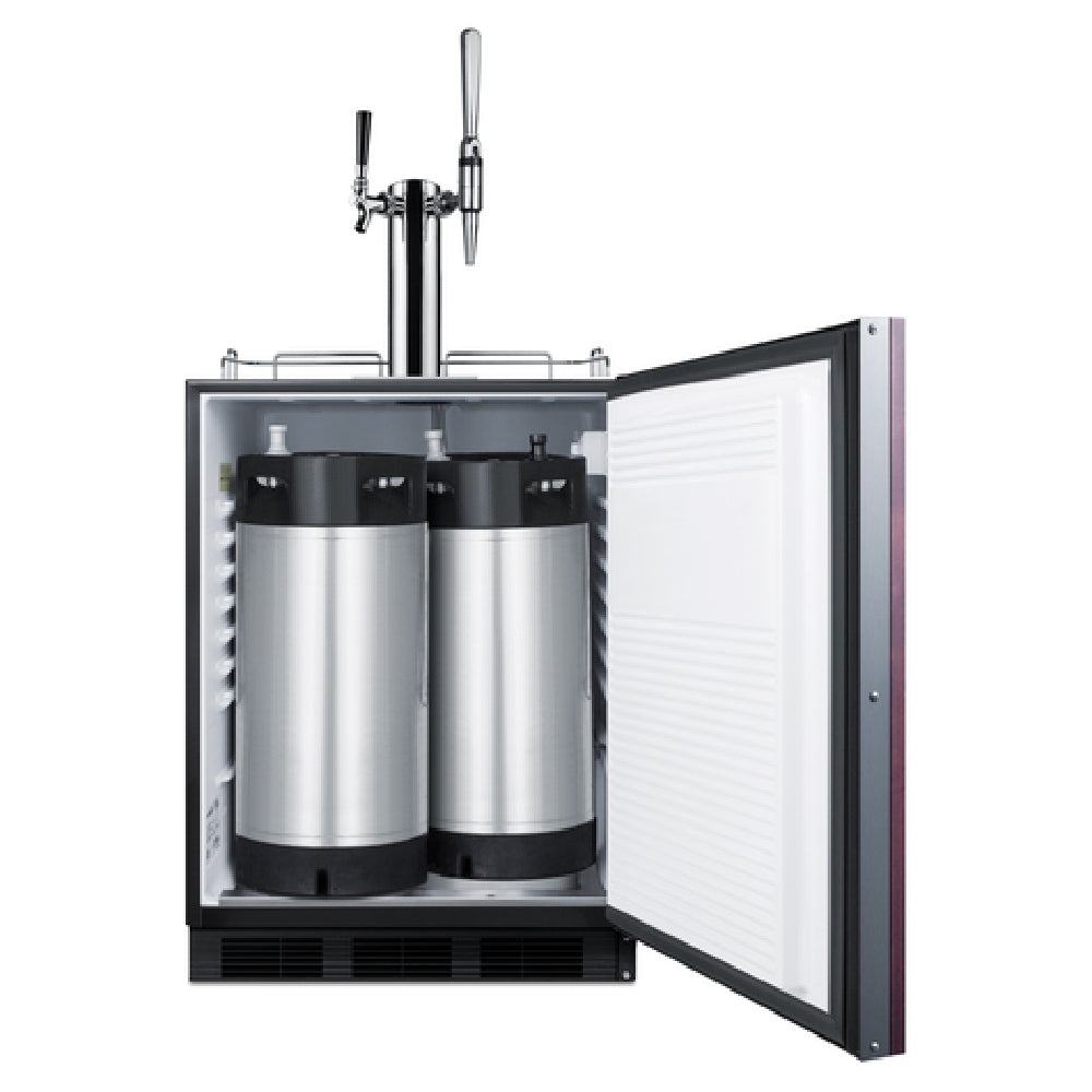 The Summit SBC58BLBIADAIFCMTWIN Combo Nitro/Cold Brew Coffee Dispenser is a versatile unit designed for both built-in and freestanding applications, with a 24-inch width and a generous 5.5 cubic feet capacity. This dispenser is capable of accommodating two Cornelius kegs, ensuring ample storage for high-demand environments. With a temperature range of +34°F to +43°F, it offers a dial thermostat for precise control, alongside an automatic defrost feature for convenience. The commercial-grade tap kit includes a nitrogen tank, brackets, and a dual tap stainless steel draft tower equipped with both standard and stout taps for versatile beverage dispensing. The unit is ADA compliant, featuring a factory reversible right-hinged panel-ready door, an interior light, and an exterior fan for optimal performance. For added durability, it includes a stainless steel guard rail, a removable stainless steel drip tray, and a seamless interior liner with a stainless steel floor cover. The black cabinet houses an R600a Hydrocarbon refrigerant system, operating on 115v/60/1-ph with a current draw of 1.2 amps. The dispenser is cETLus, ETL-Sanitation, NSF-7, and UL-471 certified, making it suitable for commercial use in various professional settings.