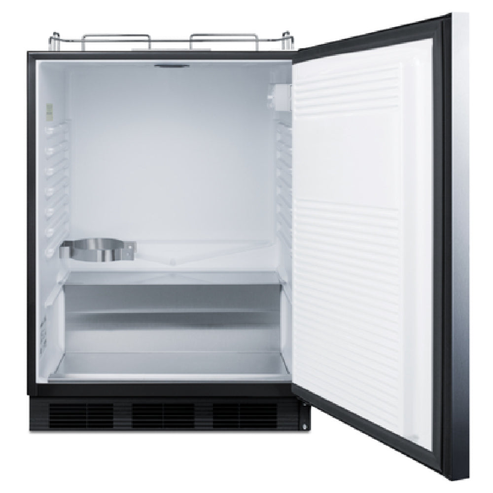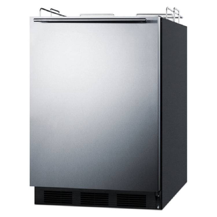 The Summit SBC58BLBIADANK Draft Beer Cooler Dispenser is an ADA-compliant masterpiece, designed to cater to both commercial and residential settings. With a sleek, front-breathing design, this unit is versatile, serving as either a built-in or freestanding installation. Measuring 24 inches in width, it boasts a substantial 5.5 cu. ft. capacity, comfortably accommodating two 1/6 kegs. Its dial thermostat offers a precise temperature range from +34°F to +43°F, ensuring optimal beer storage conditions. The cooler features an automatic defrost system and is equipped with a stainless steel guard rail and a removable drip tray, enhancing its practicality. The reversible right-hinged door, crafted from 304 stainless steel, includes a thin horizontal brushed handle for an elegant touch. Internally, the cooler is illuminated and lined seamlessly with a stainless steel floor cover that ensures durability. Powered by a self-contained bottom-mounted compressor, utilizing R600a Hydrocarbon refrigerant, this unit operates efficiently on 115v/60/1-ph, drawing just 1.2 amps. Certified by cETLus and ETL-Sanitation, the Summit SBC58BLBIADANK is a hallmark of quality and compliance, making it a valuable addition for bars, restaurants, or home kitchens seeking a reliable draft beer solution.