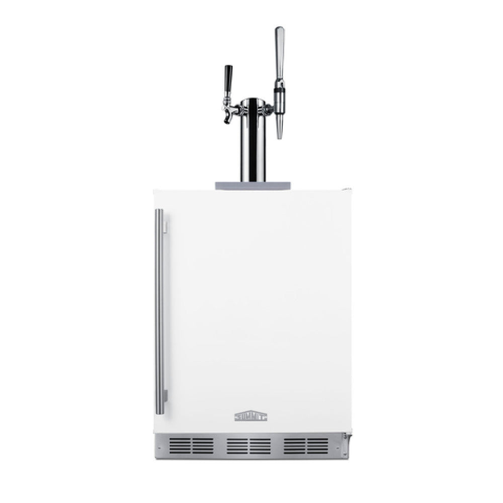 The Summit SBC58WHBIADACMTWIN Coffee Kegerator 24" Wide White Finish is a versatile and feature-rich appliance, tailored for both commercial and residential settings that require dual coffee dispensing solutions. This unit stands out with its ability to dispense both flat and nitro-infused coffee, catering to diverse coffee preferences. With ADA compliance, it boasts a convenient 32" height, making it accessible for all users. The kegerator is designed for indoor use and can be seamlessly integrated as a built-in unit or used as a freestanding appliance. It comes equipped with a stainless steel dual tap tower, a 5 lb nitrogen tank, and a regulator, ensuring smooth and efficient operation. Added convenience is provided by its connections for ball lock Cornelius kegs. The interior features a light, stainless steel drip tray, and floor cover, enhancing usability and cleanliness. With an interior tank holder and adjustable dial thermostat, users can easily manage temperature settings. The automatic defrost function further simplifies maintenance. This kegerator is capable of holding two 1/6 kegs, uses R600a refrigerant, and is 100% CFC free. Compliance with CARB and ETL (ETL-C, ETL-S) standards ensures safety and environmental responsibility, making it a reliable choice for coffee enthusiasts and businesses alike.