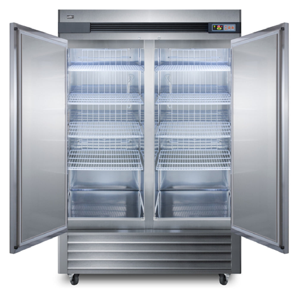 The Summit SCFF497 All-Freezer Upright Reach-in is a commercial-grade freezer engineered for optimal storage and temperature management, catering to various industry needs. With its impressive 49 cubic feet capacity, this two-section unit measures 56 inches in width, making it suitable for large-scale storage requirements. The freezer is equipped with two self-closing solid French doors featuring a 90-degree stay-open function, enhancing accessibility and convenience. Inside, users benefit from eight adjustable wire shelves and an LED interior light for easy organization and visibility. This model incorporates advanced features such as audible open door alarms and both visual and audible temperature alarms, ensuring safety and efficiency. The Summit SCFF497 maintains a temperature range from -10°F to +25°F, managed by a digital control system with an LED display. Designed with a stainless steel interior and exterior, it guarantees durability and ease of maintenance. Mobility is facilitated by four 6-inch casters, while the bottom-mounted compressor utilizes R290 Hydrocarbon refrigerant for environmentally friendly operation. The self-contained refrigeration system operates on 115V/60Hz/1-phase power, drawing 10.5 amps. Certified by UL, ULC, and ETL-Sanitation, this freezer meets rigorous commercial standards, positioning it as a reliable choice across various market segments.