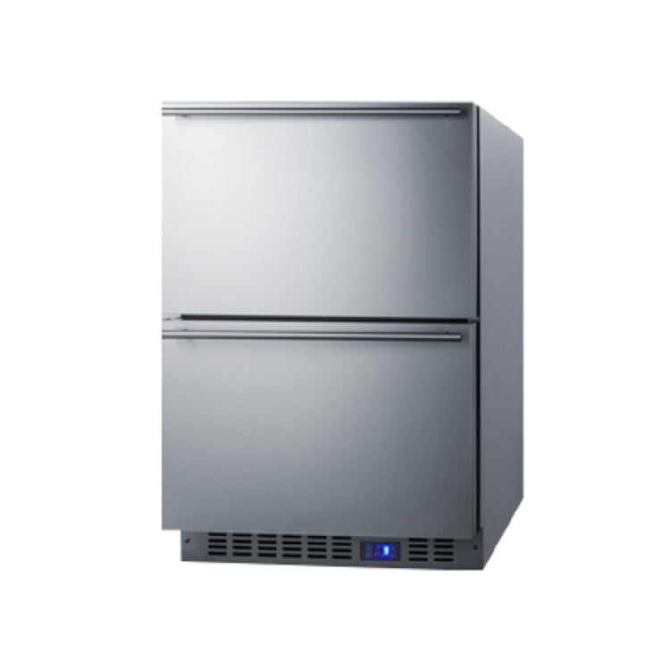 The Summit SCFF532D All-Freezer Two Drawers Frost-free is a versatile and efficient freezer designed for commercial use, offering both built-in and freestanding installation options. With dimensions of 23.63"W x 23.63"D x 34"H, this unit provides a generous 3.54 cubic feet of storage space. Equipped with a digital thermostat, the SCFF532D allows precise temperature control, complemented by a temperature memory function and alarms for temperature deviations and open drawers. Its stainless steel exterior and interior, along with stainless steel handles, ensure durability and a sleek appearance. The freezer also features a sealed back and LED lighting for enhanced visibility. Inside, a sliding chrome basket and two adjustable drawer dividers offer organized storage, making it suitable for various commercial settings. The SCFF532D operates on 115v/60/1-ph with a low energy usage of 0.8 amps, reflecting its energy-efficient design. Additionally, it includes a Sabbath mode, catering to specific user requirements. Certified by ETL-Sanitation, ETL, and cETL, this freezer meets stringent commercial standards, making it an ideal choice for businesses that demand reliability and compliance with health regulations.