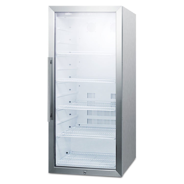 The Summit SCR1006CSS Beverage Center One-section Self-contained Refrigeration is a premium commercial appliance designed to meet diverse refrigeration needs across various industry segments. This unit boasts a spacious 9.0 cubic feet capacity, allowing ample space for beverage storage. Its dimensions - 21-1/4"W x 24-1/2"D x 48-1/2"H - make it a compact yet efficient choice for tight spaces. The beverage center operates within a temperature range of 34°F to 43°F, ensuring optimal cooling for various beverages. It features fan-forced cooling technology, which promotes even air distribution for consistent temperature maintenance. The reversible hinged glass door, framed with stainless steel, provides durability and security with a locking mechanism. Furthermore, the unit is equipped with five adjustable wire shelves, allowing customization of storage space. A digital thermostat facilitates precise temperature control, while the automatic defrost feature ensures hassle-free maintenance. The LED lighting enhances visibility, making product selection easier. Constructed with a sleek stainless steel exterior, the Summit SCR1006CSS is both aesthetically pleasing and easy to clean. Operating at 115v/60/1-ph and drawing 2.0 amps, this ETL and ETL-Sanitation certified beverage center is a reliable and efficient solution for commercial refrigeration needs.