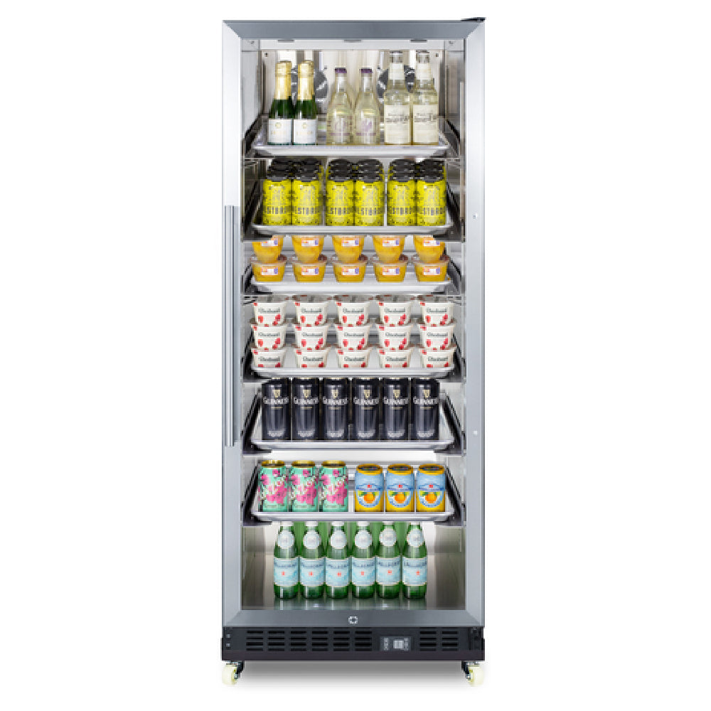 The Summit SCR1156RI Beverage Center One Section 11 Cu. Ft. Capacity is an advanced refrigeration solution tailored for commercial use, featuring a self-contained bottom-mount refrigeration system. It boasts a self-closing right-hinged glass door equipped with a secure lock, ensuring the safety of stored beverages. The interior is designed with six adjustable tray holders on cantilevered shelving, complemented by six aluminum half-sheet pans and six chrome shelves, providing versatile storage options. Enhanced with LED lighting and digital controls, the beverage center ensures optimal visibility and precise temperature management. The robust stainless steel interior is contrasted by a sleek black exterior finish, aligning durability with modern aesthetics. Utilizing R600a hydrocarbon refrigerant, the Summit SCR1156RI is eco-friendly and energy-efficient, further validated by its ENERGY STAR certification. The unit's removable dolly facilitates easy mobility and placement within any commercial setting. Operating at 115v/60/1-ph and drawing only 1.7 amps, the beverage center is efficient in its energy usage. Additionally, it comes with a cord and plug for straightforward installation. Certified by ETL standards, the Summit SCR1156RI Beverage Center is a reliable and high-performing choice for diverse industry segments requiring dependable beverage refrigeration solutions.