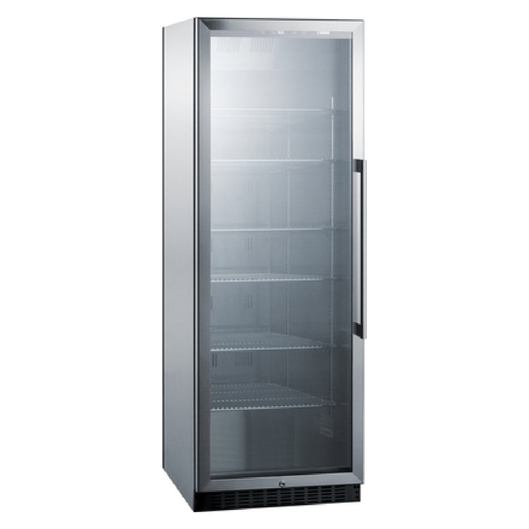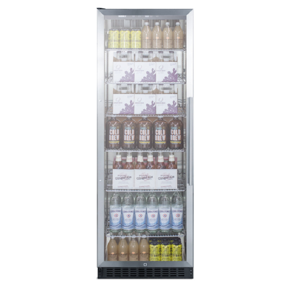 The Summit SCR1401LHCSS Beverage Center One-section 24"W is a high-performance appliance designed to cater to the precise needs of commercial environments requiring reliable beverage storage solutions. With a spacious 12.6 cu. ft. capacity, this unit efficiently accommodates a variety of beverages. It features a frost-free operation, ensuring consistent temperature control and minimal maintenance. The self-closing left hinged glass door, framed with sleek stainless steel trim, enhances both functionality and aesthetic appeal. Illuminated by recessed LED lighting, the interior is thoughtfully designed for visibility and accessibility. The digital thermostat provides precise temperature management, accommodating different beverage requirements. Inside, six adjustable chrome shelves facilitate flexible storage configurations, while an integrated interior fan ensures uniform cooling. The robust stainless steel construction of both interior and exterior components underscores durability and longevity. Utilizing R600A Hydrocarbon refrigerant, this beverage center is energy-efficient and environmentally friendly. Operating at 115v/60/1-ph with a current of 1.7 amps, it integrates seamlessly into diverse commercial settings. Certified by ETL-Sanitation to NSF-7 standards, along with ETL and cETL certifications, the Summit SCR1401LHCSS meets rigorous commercial safety and hygiene requirements, making it an excellent choice for restaurants, bars, and hospitality venues seeking dependable and sophisticated beverage storage.