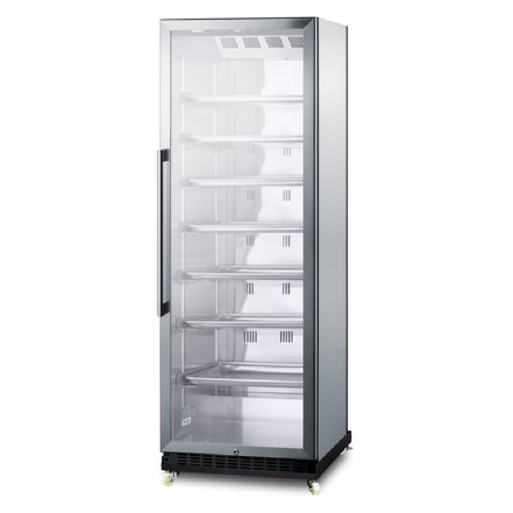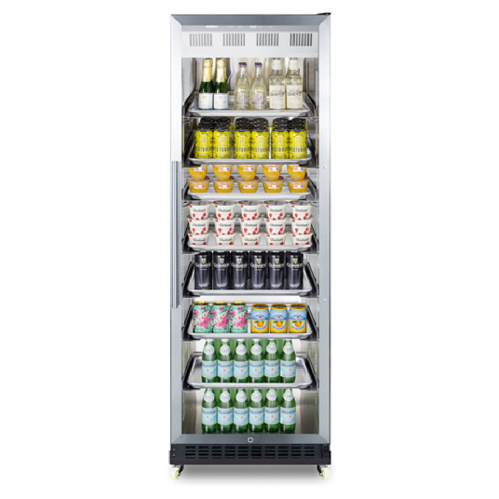 The Summit SCR1401RICSS Beverage Center - One Section - 12.6 Cu. Ft. Capacity is an advanced refrigeration unit tailored to meet the diverse needs of commercial spaces requiring reliable beverage storage. Boasting a self-contained bottom mount refrigeration system, this unit ensures efficient cooling and easy access. It features a self-closing right-hinged glass door equipped with a lock, providing security and energy efficiency. The interior is designed with seven adjustable tray holders on cantilevered shelving, complemented by seven aluminum half sheet pans and seven chrome shelves, allowing for flexible storage configurations. Enhanced by LED lighting and digital controls, the unit offers a user-friendly experience with precise temperature management. The frost-free operation guarantees optimal performance without manual defrosting. A stainless steel interior coupled with a black exterior finish delivers a sleek and durable product design. Operating with R600a hydrocarbon refrigerant, the beverage center emphasizes environmental responsibility. Additionally, a removable dolly facilitates easy mobility, making it versatile for dynamic commercial environments. With a power specification of 115v/60/1-ph and 1.7 amps, the unit is equipped with a cord and plug, ensuring convenient installation. Certified by ETL for commercial use, the Summit SCR1401RICSS Beverage Center represents a blend of innovation and practicality for various industry markets.