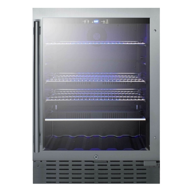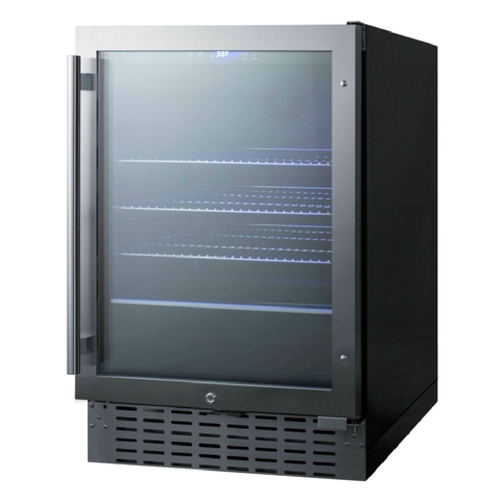 The Summit SCR2466B Beverage Merchandiser Reach-in One-section is a versatile refrigeration unit designed to meet commercial needs with precision. With a compact width of 23-1/2 inches and a generous 4.2 cubic feet capacity, this merchandiser can hold up to six bottles. It features a stainless steel framed glass hinged reversible door complete with a lock, ensuring both accessibility and security. A professional style vertical handle adds a touch of elegance while facilitating user interaction. The interior is illuminated by dimmable LED lighting, enhancing product visibility. Equipped with three adjustable chrome shelves and one adjustable glass shelf, it can accommodate various beverage sizes, including wine bottles. The slotted floor design aids in optimal air circulation, while the automatic defrost function ensures minimal maintenance. A digital thermostat provides precise temperature control, supported by a fan-cooled compressor for efficient cooling. The exterior is finished in classic black, and the unit includes two leveling feet for stability. Utilizing R600a Hydrocarbon refrigerant, it is both energy-efficient and eco-friendly. Operating at 115V/60 Hz with 1.25 amps, it includes a Sabbath mode for energy conservation. Certified by ETL, cETL, and ETL-Sanitation, this merchandiser is suitable for various commercial environments, from restaurants to retail spaces.