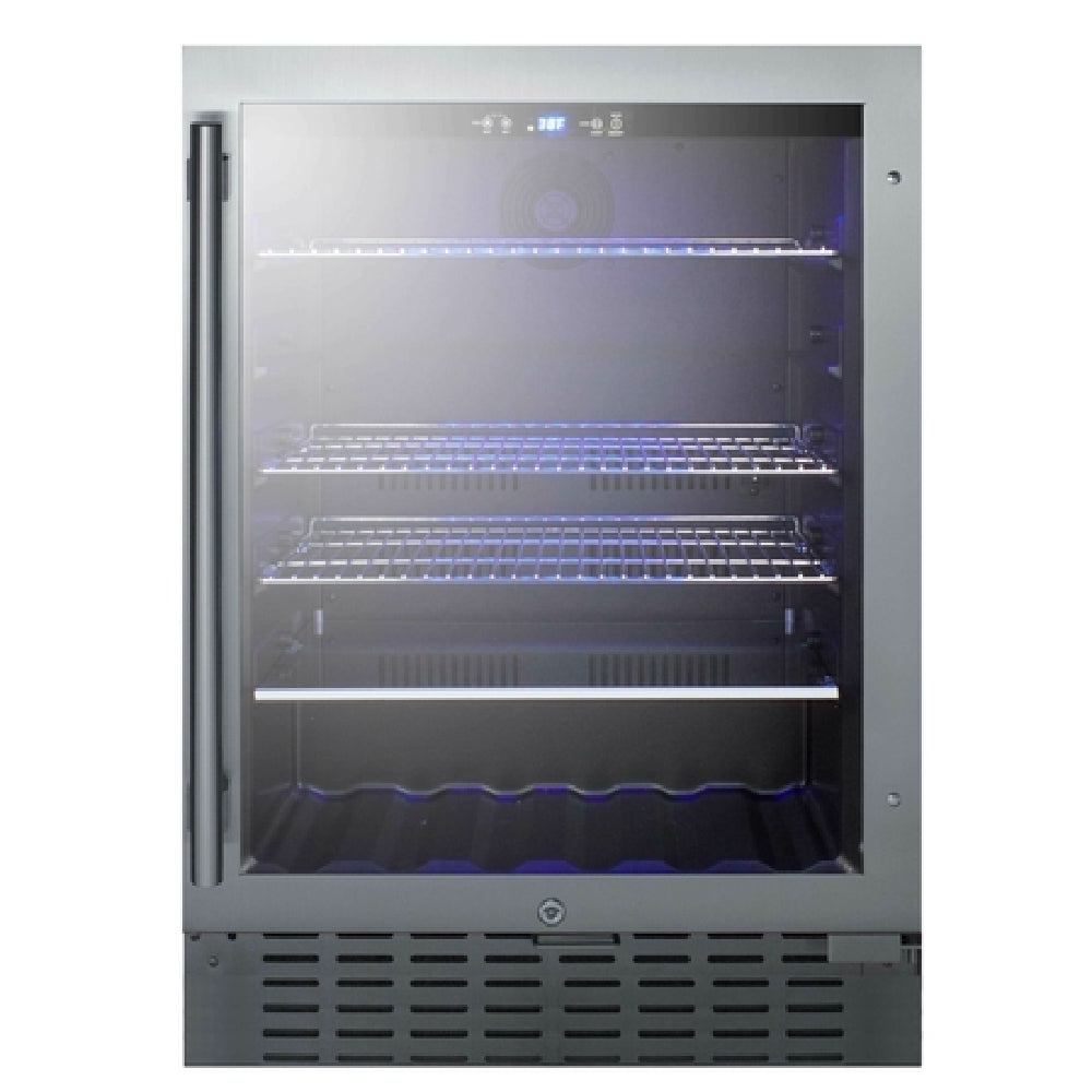 The Summit SCR2466BCSS Beverage Merchandiser is a versatile reach-in one-section unit designed for both built-in or freestanding applications, measuring at 23-1/2 inches in width. It offers a storage capacity of 4.2 cubic feet, accommodating up to six wine bottles. Equipped with a glass hinged stainless steel framed reversible door featuring a lock and a pro style vertical handle, it ensures secure and stylish access. The unit includes dimmable LED lighting to enhance visibility and presentation of beverages. Inside, it boasts three adjustable chrome shelves and one adjustable glass shelf, providing flexibility for different bottle sizes and configurations. The slotted floor design aids in efficient airflow, complemented by an automatic defrost system and a fan-cooled compressor. The exterior is crafted from durable stainless steel, ensuring longevity and aesthetic appeal. Additional features include two leveling feet for stability, a bottom mount self-contained refrigeration system utilizing R600a Hydrocarbon refrigerant, and it operates on 115V/60 Hz with 1.25 amps. The unit includes a Sabbath mode for energy conservation and compliance with religious practices. Certified by ETL, cETL, and ETL-Sanitation for commercial use, this merchandiser is a reliable choice for various market segments, emphasizing functionality, efficiency, and attractive presentation.