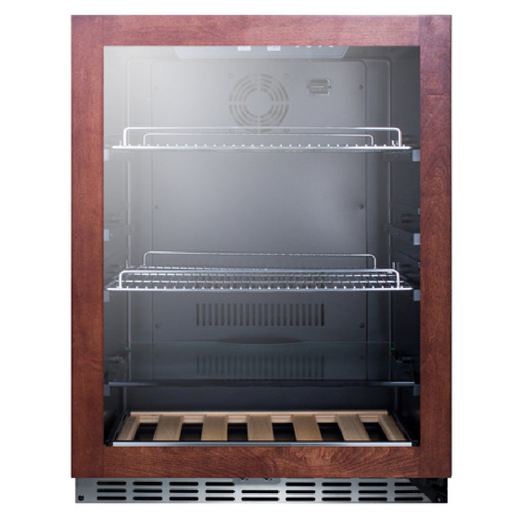 The Summit SCR2466BPNR Beverage Merchandiser is a versatile reach-in, one-section unit designed for both built-in and freestanding use. With a compact width of 23-1/2 inches, it provides a substantial 4.2 cubic feet capacity, accommodating up to six bottles. The merchandiser features a glass hinged panel-ready framed reversible door, complete with a lock for security. For adaptable display options, it includes three adjustable chrome shelves and an additional adjustable glass shelf, which can also accommodate wine bottles, enhancing its versatility for various commercial settings. The slotted floor design and automatic defrost function ensure seamless maintenance and operation. Equipped with a digital thermostat and fan-cooled compressor, this unit maintains precise cooling, supported by R600a Hydrocarbon refrigerant. The exterior is finished in sleek black, and the bottom mount self-contained refrigeration system ensures efficient performance. Additional features include dimmable LED lighting, Sabbath mode, and ETL and ETL-Sanitation (Commercial) certifications, affirming its compliance with industry standards. The Summit SCR2466BPNR Beverage Merchandiser, with its thoughtful design and advanced features, is ideal for diverse market segments, providing reliable and customizable beverage display and storage solutions for commercial environments.