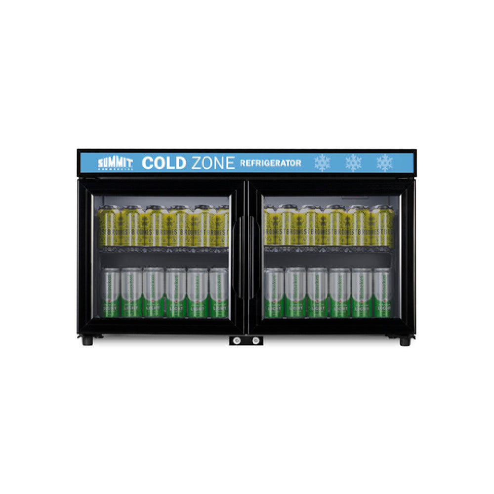 The Summit SCR3502DLL Back Bar Beverage Center Countertop 36"W is a specialized cooling solution designed for commercial environments seeking efficient beverage storage. This unit features a 36-inch width and a shallow depth, making it ideal for countertop placement where space is a premium. The two hinged self-closing glass doors are equipped with pre-installed handles and factory-installed locks, ensuring both convenience and security. Internally, the Beverage Center houses four removable shelves, complemented by digital controls and LED lighting for easy access and visibility. A customizable exterior LED-lit canopy adds to its aesthetic appeal, allowing businesses to tailor its look to their branding. The automatic defrost feature, coupled with a temperature alarm, ensures consistent cooling performance, while the sealed back and internal fan enhance operational efficiency. The black cabinet design is both sleek and functional, adhering to CARB compliance standards. Operating at 115V/60/1-ph, this unit is UL, CSA, and NSF certified, ensuring it meets stringent commercial standards. The Summit SCR3502DLL is an ideal choice for restaurants, bars, and hospitality venues requiring a reliable, visually appealing, and secure option for beverage storage and display.