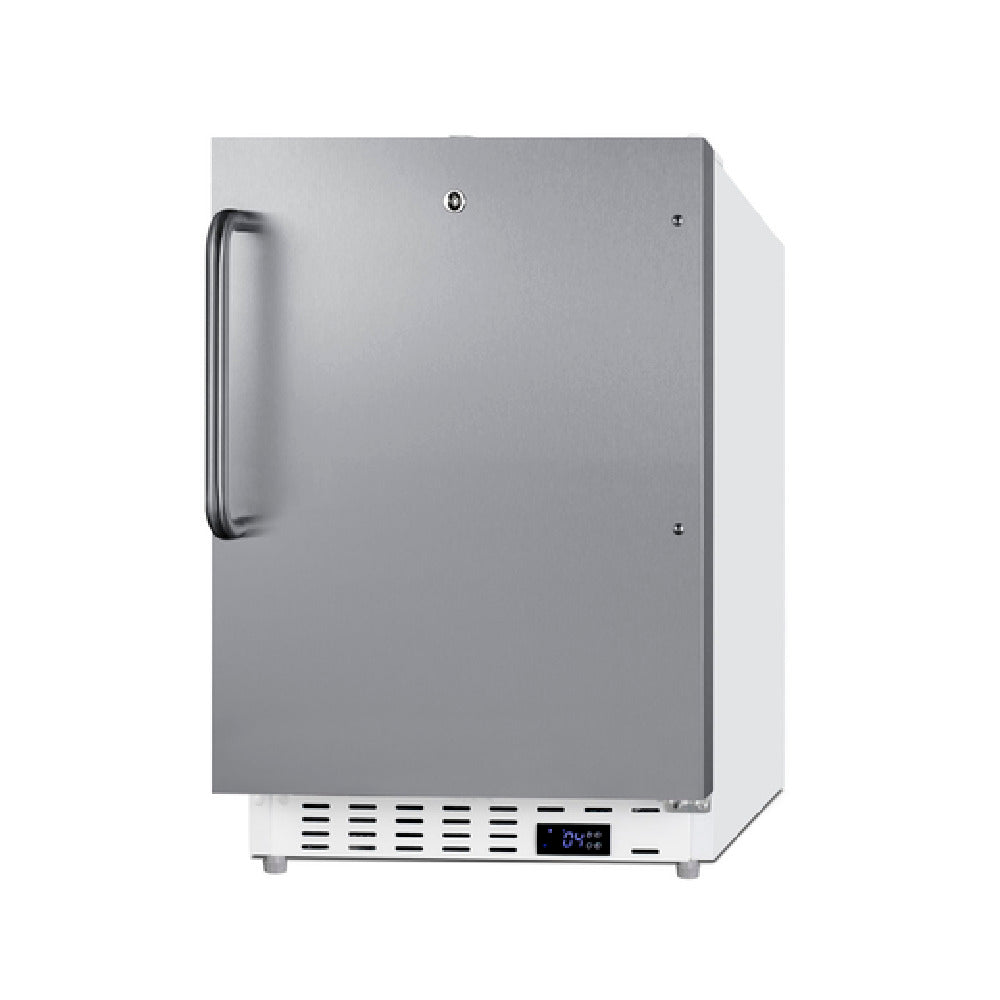 The Summit SCR504SSTBADA Undercounter All-Refrigerator is a versatile and efficient cooling solution designed to meet diverse industry needs with its upright design suitable for both built-in or freestanding installations. This unit is ADA compliant with a 32-inch height, ensuring accessibility. It operates within a temperature range of 2 to 8°C, thanks to its advanced digital thermostat, making it ideal for precise temperature management. Featuring a sealed back and 3-inch thick reversible stainless steel door equipped with a towel bar handle, it combines durability with convenience. The factory-installed lock and magnetic door gasket offer enhanced security and energy efficiency. The refrigerator's white cabinet exterior houses four adjustable wire shelves, providing customizable storage options. Additional features include a factory-installed probe hole and a hospital-grade cord with a 'green dot' plug. The automatic defrost function, along with open door and high/low temperature alarms, ensures optimal operation and maintenance. Utilizing R600a refrigerant, this unit is energy efficient and environmentally friendly. It operates on 115v/60/1-ph, and its compliance with cETLus and ETL-Sanitation standards underscores its quality and safety for commercial use. The Summit SCR504SSTBADA is an ideal choice for healthcare, hospitality, and commercial settings seeking reliable refrigeration solutions.