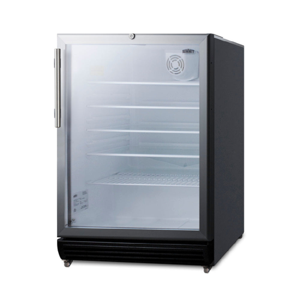 The Summit SCR600BGLMBL Commercial Beverage Center is a versatile and efficient solution for beverage storage in various commercial settings. This freestanding unit is equipped with four pre-installed 1-inch high casters, two of which are locking, allowing for effortless portability and secure placement. The beverage center features a durable 304-grade stainless steel work surface, providing a robust and long-lasting area for preparation or display. Its double pane tempered glass door enhances insulation while offering clear visibility of the contents, further secured by a factory-installed lock for added safety. The black cabinet, complemented by a stainless steel handle, presents a sleek appearance, while the reversible door design adds flexibility in placement. Inside, the 5.5 cu.ft. white interior is illuminated by a rocker switch light and includes adjustable glass shelves for customizable storage. The flat door liner and automatic defrost function contribute to low-maintenance operation, while the dial thermostat allows precise temperature control. This unit is designed to meet the stringent standards of commercial use, being UL and ETL-S certified and CARB compliant, and operates efficiently on a 115V/60 Hz power supply. The Summit SCR600BGLMBL is a practical choice for businesses seeking reliable and adaptable beverage storage solutions.