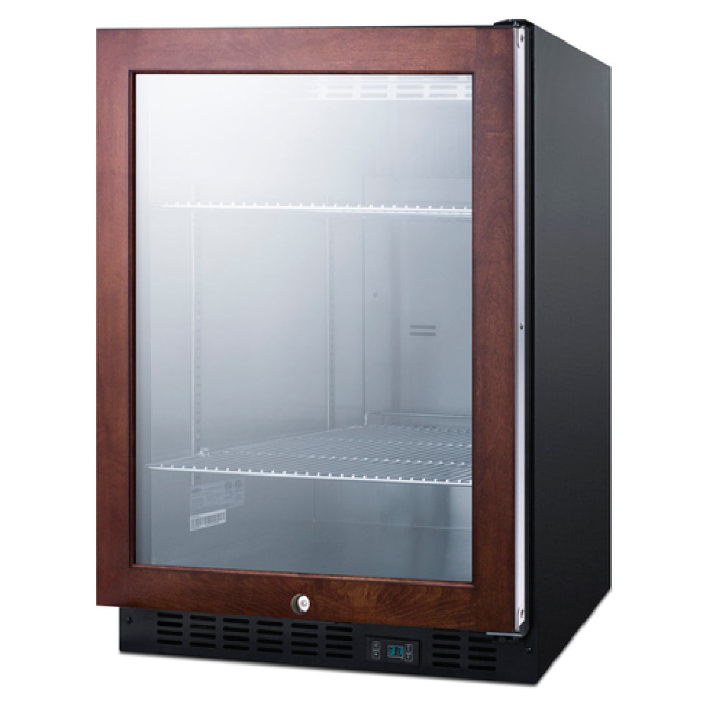 The Summit SCR610BLPNR Beverage Center Built-in Or Freestanding 24"W is a versatile and efficient refrigeration solution tailored for both commercial settings and home environments. With a compact 5 cu. ft. capacity, it accommodates a variety of beverages, making it ideal for small-scale operations or personal entertainment spaces. The unit features a self-contained bottom-mounted refrigeration system, ensuring consistent cooling performance. A factory reversible right-hinged locking glass door with panel-ready trim adds a customizable and secure element to the design. Its three adjustable chrome shelves, equipped with cantilevered clips, provide flexible storage options. The digital controls allow precise temperature management, ranging from 36°F to 68°F, suitable for different beverage types. Enhanced with an LED light and automatic defrost, the center ensures ease of use and maintenance. Its stainless steel interior coupled with a sleek black cabinet enhances durability and aesthetic appeal. The interior and exterior fan improve air circulation, supporting the energy-efficient R600a Hydrocarbon refrigerant, which aligns with the unit's ENERGY STAR™ certification. Operating at 115v/60/1-ph and 0.8 amps, the Summit SCR610BLPNR is cETLus and ETL-Sanitation certified, affirming its compliance with industry standards, making it a robust choice for diverse market segments.