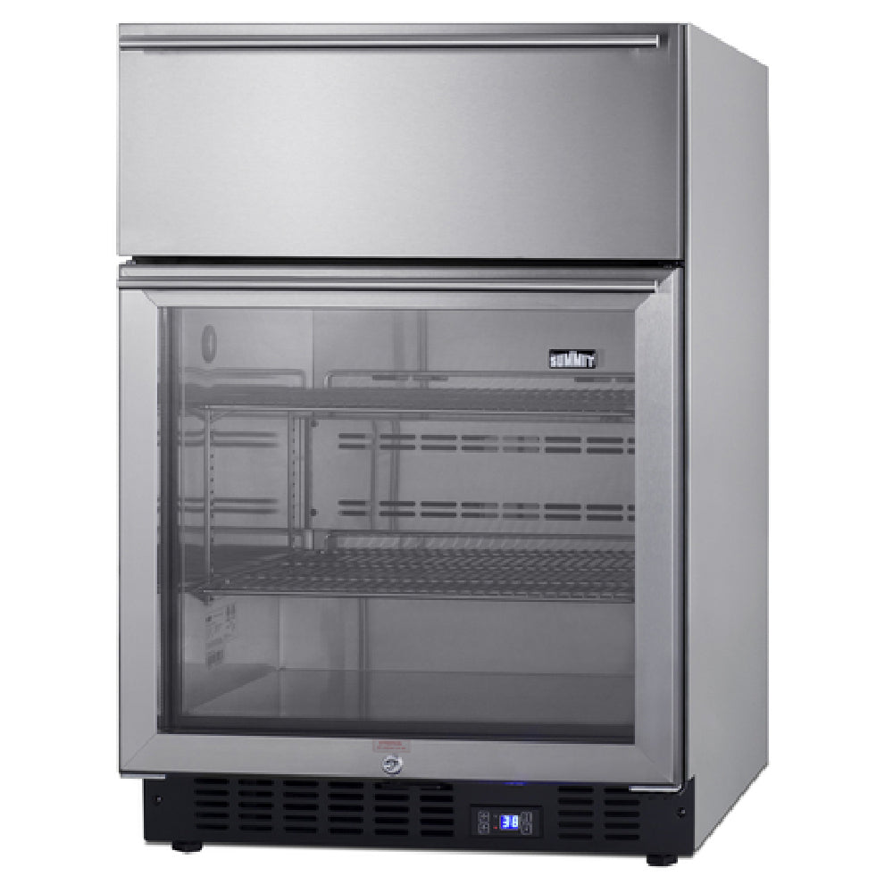 The Summit SCR615TDCSS Undercounter All-Refrigerator Built-in Or Freestanding One-section stands out in the commercial refrigeration industry with its versatile design and robust technical specifications. Measuring 23.63 inches in width, 25 inches in depth, and 34 inches in height, it offers a 4.76 cubic feet capacity, making it an ideal choice for compact spaces. This all-refrigerator model features a bottom mount self-contained refrigeration system and a reversible right-hinged glass door with stainless steel trim that includes a secure locking mechanism. The unit is equipped with one slide-out refrigerated drawer and two chrome shelves, providing ample storage options. It is further enhanced with energy-efficient LED lighting and a digital thermostat for precise temperature control. Its stainless steel exterior not only offers durability but also adds a sleek, modern aesthetic. The auto defrost function ensures minimal maintenance, while the level legs provide stability. Operating at 115 volts, 60 Hz, and 1.0 amp with an included cord and plug, it meets ETL, ETL-Sanitation, and cETL commercial standards. This refrigerator's flexible design allows it to be used as a built-in or freestanding unit, catering to various business needs within the foodservice and hospitality sectors.