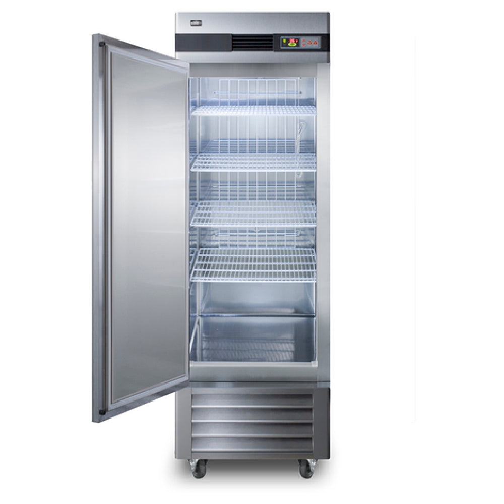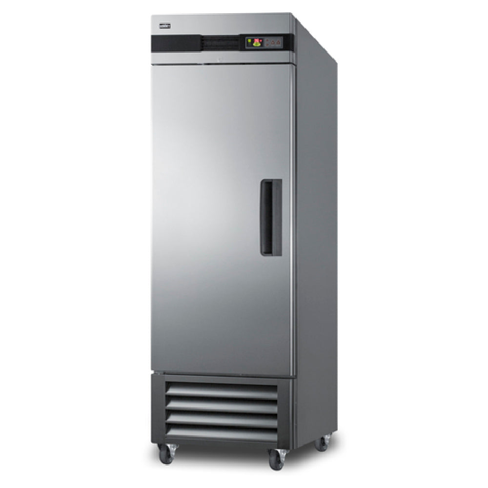 The Summit SCRR232LH Refrigerator Reach-in One-section is a meticulously engineered cooling unit tailored to meet the demands of commercial settings. With a compact 28-inch width, it offers a generous 23 cubic feet capacity, making it an ideal choice for establishments that require efficient space utilization. This refrigerator features a robust left-hinged, self-closing solid door equipped with a lock for enhanced security. Inside, it houses four adjustable wire shelves, allowing for flexible storage configurations. An interior light ensures visibility, while the open door and temperature alarms boost operational safety. The refrigerator employs a forced-air cooling system, paired with a digital thermostat, to maintain precise temperature regulation. An automatic defrost function adds to its convenience, reducing maintenance demands. Constructed with durable stainless steel both inside and out, this unit is designed to withstand rigorous commercial use. It is mounted on four casters, two of which are locking, facilitating easy mobility and stability. Using R290 Hydrocarbon refrigerant, this model is environmentally friendly. Operating on a 115v/60/1-phase power supply with a 7.5-amp draw, this refrigerator is UL, ULC, and ETL-Sanitation approved, underscoring its compliance with stringent commercial standards. This product’s combination of capacity, security, and efficiency makes it a valuable addition to any food service operation.
