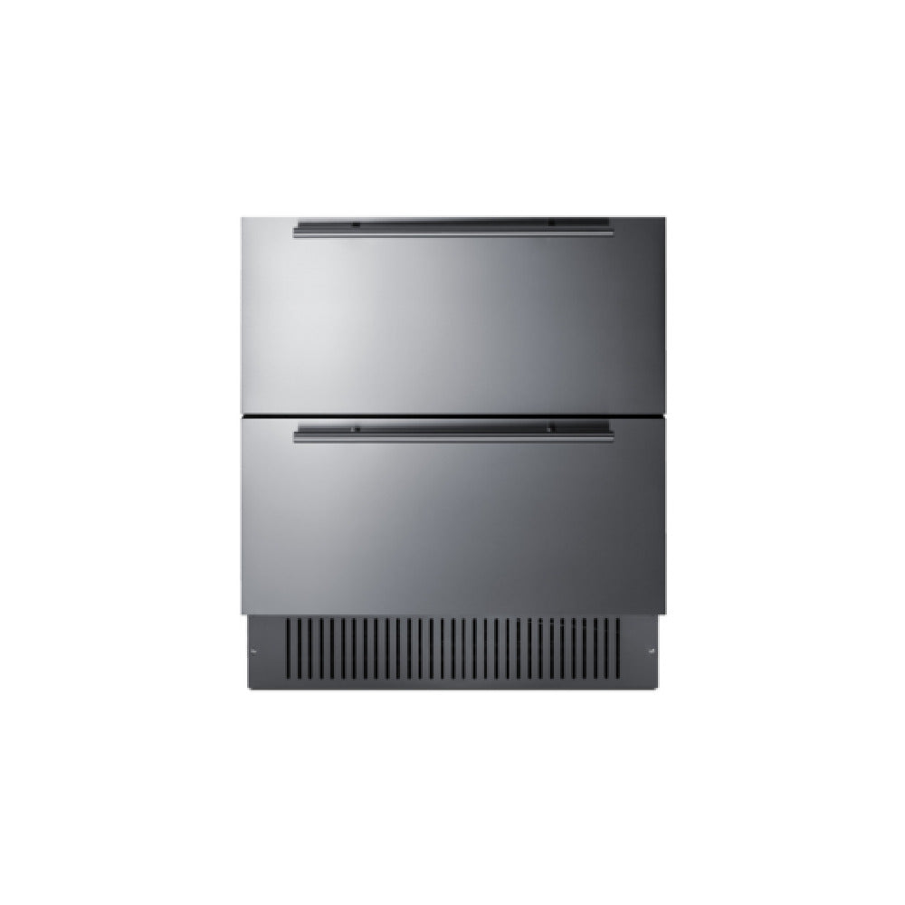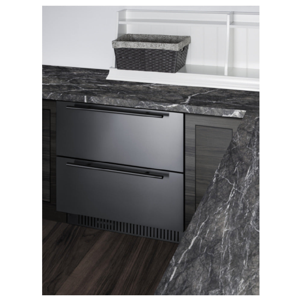 The Summit SPR3032D All-refrigerator 30" Wide Shallower Depth (23.25" Deep) is a versatile refrigeration unit with a 5.42 cu.ft. capacity designed to meet diverse cooling needs. Its compact design, with a shallower depth, allows for flexibility in placement, suitable for both built-in and freestanding installations. This all-refrigerator unit is equipped with 2 drawers featuring stainless steel fronts and interiors, making it ideal for both indoor and outdoor use. The appliance operates within a temperature range from 34 to 65°F, providing precise cooling control through digital controls. It includes a removable divider for customizable storage and features LED lighting for enhanced visibility. This model is environmentally friendly, using R600a hydrocarbon refrigerant, and is 100% CFC free, aligning with CARB regulations. Additional convenience is offered with features such as an open drawer alarm, sabbath mode, and the ability to accept custom panels, while the stainless steel handles and black cabinet finish enhance its aesthetic appeal. The Summit SPR3032D is ETL, ETL-C, and ETL-S certified, catering to both commercial and residential applications, making it a reliable and efficient choice for various market segments within the refrigeration industry.