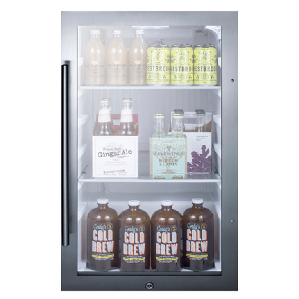 The Summit SPR489OSADA Outdoor Beverage Center is a versatile refrigeration solution ideal for both residential and commercial environments, offering a built-in or freestanding installation option. With its compact dimensions of 19"W x 17"D, this appliance is ADA compliant, making it accessible and user-friendly. It boasts a 3.13 cu. ft. capacity, accommodating a variety of beverages across three adjustable glass shelves and dedicated can storage. This beverage center operates within a temperature range of 34°F - 50°F, regulated via a dial thermostat, and features automatic defrost for minimal maintenance. Enhanced by LED lighting, it provides a clear view of the contents through its reversible right-hand swing glass locking door, framed with seamless stainless steel trim. The unit's black interior and cabinet provide a sleek and modern appearance, while its weatherproof design ensures durability in outdoor settings. Equipped with two level legs and a right angle plug, it promises stability and ease of installation. Utilizing R600a Hydrocarbon refrigerant, this model is CARB compliant, and operates efficiently on 115v/60/1-ph with 1.3 amps. The Summit SPR489OSADA is cETLus and ETL-Sanitation certified, emphasizing its commercial-grade quality and safety standards, making it a reliable choice for diverse industry needs.