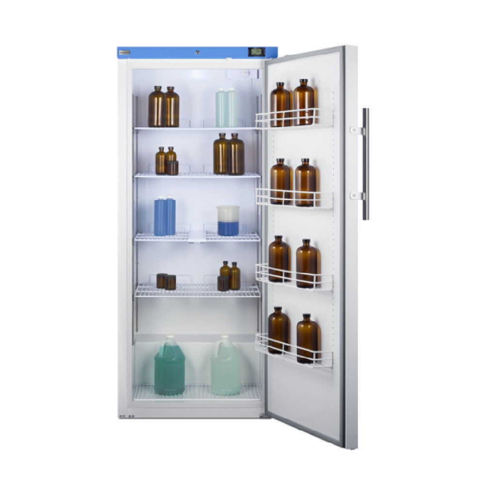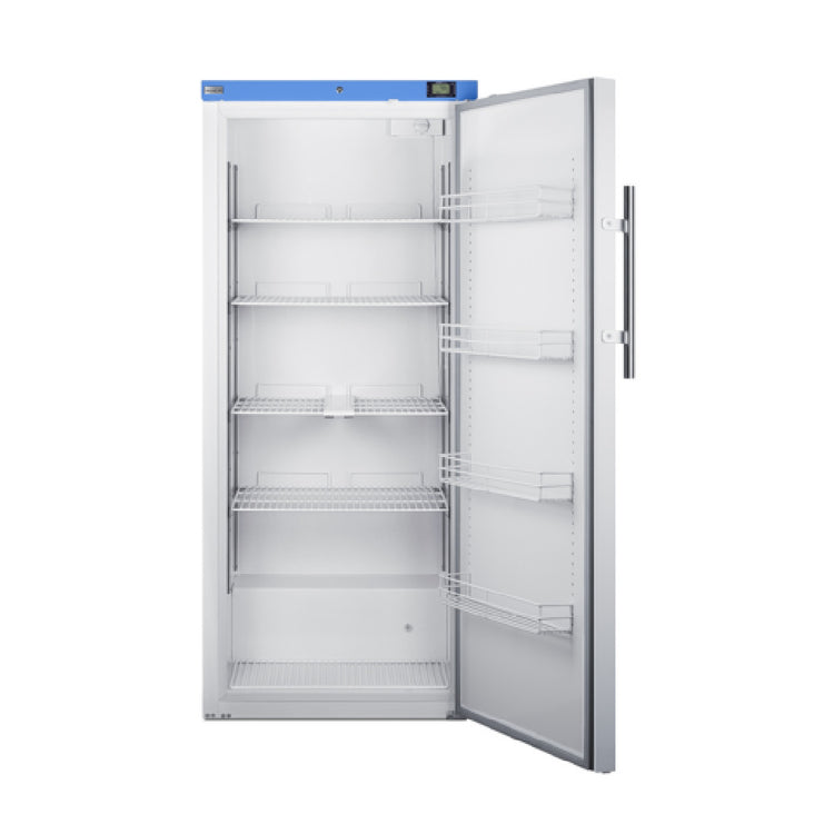 The Summit URM19W Upright General Purpose All-Refrigerator stands at 30.5" wide, engineered for precision in temperature-sensitive environments. It caters to the storage of enzymes, reagents, samples, and laboratory/clinical materials, maintaining a stable operation range of 1 to 10ºC. This refrigerator offers an 18.3 cu.ft. interior, accommodating various storage needs with its four epoxy-coated adjustable wire shelves, enhancing organization and flexibility. It features a manual defrost system and a dial thermostat for precise temperature control. For user convenience, the front panel includes an external temperature readout, complemented by a high-low temperature alarm to ensure optimal storage conditions. The design incorporates a 3/8" probe hole and LED lighting for easy access and visibility. A right-hand door swing and factory-installed lock provide security and accessibility, while the 9.5" long cord with a hospital-grade plug ensures compatibility in clinical settings. This model is CARB compliant, utilizing R290a hydrocarbon refrigerant, guaranteeing it is 100% CFC free. The unit operates at 115V/60hz and is certified by ETL, ETL-C, and ETL-S standards. Its white exterior finish and leveling legs add to its aesthetic and functional appeal. For complementary storage solutions, it pairs with the matching UFM19W freezer.