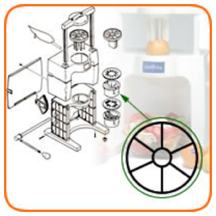 The Sunkist S-32B Apple Corer Blade Cup With Cover (6) Wedge is a precision-engineered accessory designed to enhance the efficiency of your fruit processing operations. This product, tailored to fit the S-33 model, exemplifies advanced design and functionality by incorporating a blade cup that meticulously cores and sections apples into six equal wedges. The inclusion of a cover not only ensures cleanliness and safety during operation but also extends the longevity of the blade's sharpness by protecting it from environmental elements. This unique combination of features makes it a valuable asset in commercial kitchens, particularly within the foodservice industry, where precision and efficiency are paramount. The Sunkist S-32B is ideal for businesses that require consistent, repeatable results, such as catering services, restaurants, and institutional kitchens. Its compatibility with the S-33 model further underscores its versatility and ease of integration into existing workflows, offering an effective solution for those seeking to streamline their fruit preparation processes. This apple corer blade cup represents a commitment to quality and innovation, ensuring that users can deliver top-notch culinary experiences with minimal effort.