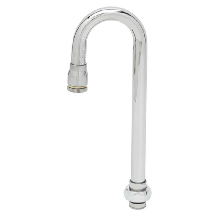 The T&S Brass 132XM Nozzle Swivel 9" H is a meticulously engineered product designed to meet the rigorous demands of the plumbing and food service industries. This gooseneck-style nozzle features a 9-inch height, providing ample clearance and flexibility in various applications. With a 2-7/8" spread, it is expertly crafted to ensure optimal water flow control. The nozzle is equipped with a stream regulator outlet, which enhances water efficiency and precision, making it an ideal choice for settings requiring exact water delivery. Constructed from chrome-plated brass, the T&S Brass 132XM ensures durability and resistance to corrosion, a critical feature for long-term use in commercial environments. It is low-lead compliant, addressing safety and health concerns, and aligning with contemporary environmental standards. Additionally, this nozzle is ANSI and NSF certified, highlighting its adherence to industry standards for quality and safety. Packaged in a master pack containing six units, it is perfect for businesses seeking reliable and efficient plumbing solutions. Its versatile design and robust features make it a suitable addition to a wide range of professional settings, from restaurants to industrial kitchens, where performance and reliability are paramount.
