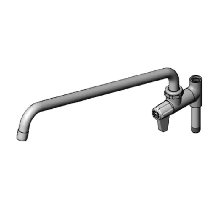 The T&S Brass 5AFL16 Equip Add-On Faucet is an 18-7/16" long standard faucet designed for versatility and durability in various commercial settings. It features cerama cartridges, which are known for their reliability and long-lasting performance, making it an ideal choice for establishments that prioritize efficient water delivery systems. The faucet is equipped with a lever handle, ensuring ease of operation and precise control over water flow. Additionally, it includes a laminar outlet, which delivers a non-aerated stream of water, reducing splash and enhancing sanitation. The package comes with a 16-1/8" swivel nozzle, offering flexibility in water direction and reach, crucial for pre-rinse units. It has a 3/8" male NPT and a 3/8" female NPT, catering to various plumbing configurations. This add-on faucet is ADA Compliant, ensuring accessibility and usability for all users, aligning with inclusive design standards. It is a valuable addition to any professional kitchen or facility that requires a robust and adaptable water fixture. The T&S Brass 5AFL16 is well-suited to meet the demands of the foodservice industry, providing exceptional performance and compliance with essential standards.