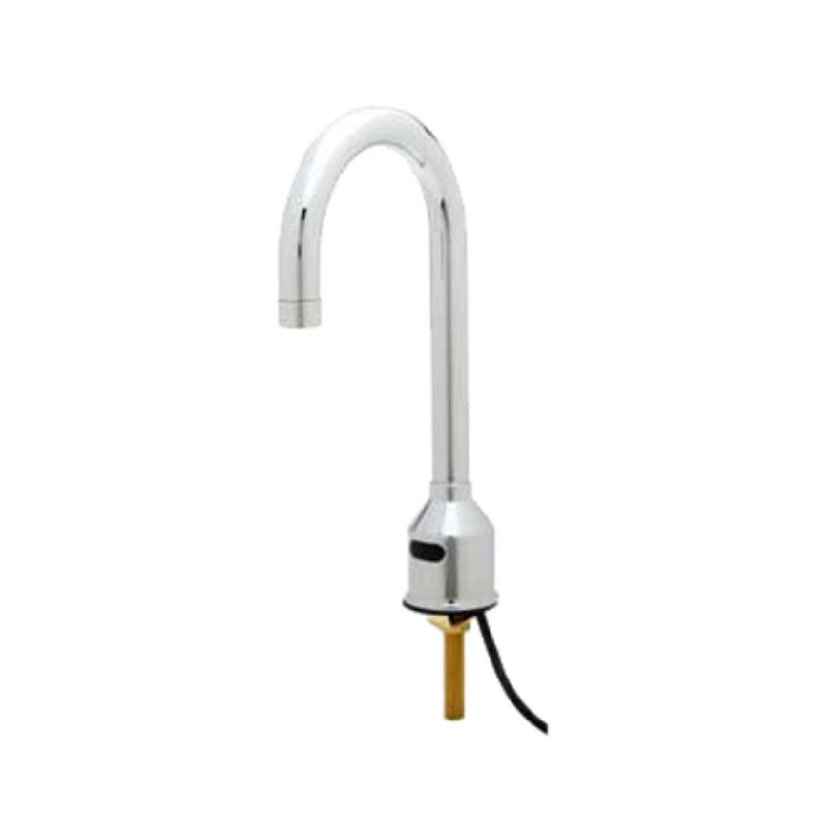 The T&S Brass 5EF-1D-DG-VF05 Equip Electronic Faucet is a highly functional and durable fixture, ideal for various commercial applications. This deck-mount, rigid faucet stands at 11-9/16 inches in height and boasts a 5-11/16 inch spread, featuring a gooseneck design that provides ample clearance for washing tasks. It is engineered with a single-hole configuration, offering ease of installation. The faucet operates with an AC/DC control module, ensuring flexibility and reliability in power sourcing. Its integrated mixing valve allows for precise temperature control, supporting diverse use cases. Designed with a removable strainer and 24-inch sensor cable, this model underscores convenience and maintenance efficiency. The delivery includes two 18-inch supply hoses and a 100-240v adapter with a 144-inch power cord, enhancing connectivity options. The non-aerated spray device functions at .5 GPM, ensuring water conservation and supporting vandal resistance. Crafted from polished chrome-plated brass, it guarantees longevity and a sleek appearance. With low-lead compliance and certification by ADA, ANSI, UL, and NSF, the T&S Brass 5EF-1D-DG-VF05 stands out as a reliable and safe choice for industries requiring rigorous standards in plumbing fixtures, from healthcare to hospitality sectors.