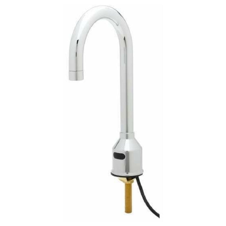 The T&S Brass 5EF-1D-DG-WS Equip Electronic Faucet Deck Mount Rigid is an advanced plumbing fixture engineered for both residential and commercial applications where hygiene and efficiency are paramount. Standing at 11-9/16 inches in height with a 5-11/16 inch spread, this gooseneck faucet is designed for a single-hole deck mount, offering a sleek and rigid installation. The faucet integrates an AC/DC control module, providing versatile power options to suit various user requirements. A mechanical mixing valve ensures precise water temperature control, while a removable strainer aids in easy maintenance. The faucet comes equipped with two 18-inch supply hoses and features a 1.5 GPM vandal-resistant aerator, making it an ideal choice for high-use environments. Constructed from low-lead, polished chrome-plated brass, the faucet meets stringent safety and quality standards, being ADA Compliant and certified by ANSI, cCSAus, cULus, and NSF. This faucet is not only a functional component but also a durable and stylish addition to any setting, ensuring compliance with health and safety regulations across different market segments within the industry.