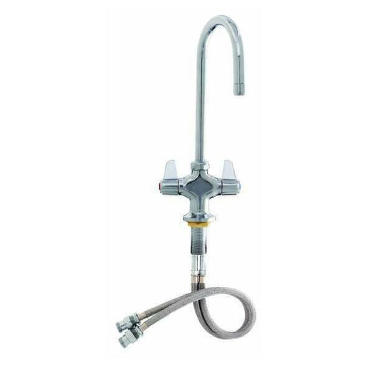 The T&S Brass 5F-2SLX05CA Equip Faucet Deck Mount Swivel is a precision-engineered faucet designed for versatility and compliance across various commercial and residential settings. With a height of 13-3/8 inches and a 5-7/8 inch spread, this faucet features a sleek gooseneck design that enhances its aesthetic appeal while offering functional utility. It is equipped with a single hole for installation and a user-friendly lever handle that allows for ease of use. The faucet incorporates quarter-turn cerama cartridges, which ensure smooth operation and durability, making it ideal for high-traffic environments. Two 18-inch flexible hoses facilitate straightforward installation and connectivity. The faucet's 2.2 GPM aerator is engineered to provide a steady and efficient water flow, while the low-lead composition highlights its compliance with stringent safety standards. The unit features a 1/2 inch male NPT connection, ensuring compatibility with a wide range of plumbing systems. Additionally, the faucet meets ADA compliance, as well as ANSI and NSF certifications, underscoring its adherence to high standards of accessibility and safety. The T&S Brass 5F-2SLX05CA Equip Faucet Deck Mount Swivel is an exemplary choice for those seeking a reliable and compliant water delivery solution.