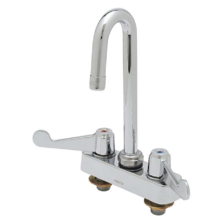 The T&S Brass 5F-4CWX03A Equip Workboard Faucet is a precision-engineered piece designed for efficiency and durability, making it a valuable addition to professional environments requiring robust water delivery systems. This faucet features a 4-inch deck mount setup, ensuring stability and easy installation in workboard situations where space is optimized. The 3-inch swivel gooseneck provides flexibility and extensive reach, allowing for versatile use across various tasks, while the quarter-turn ceramic cartridge technology ensures smooth operation and longevity, reducing maintenance needs. An aerator is integrated to enhance water flow efficiency, contributing to water conservation efforts, making it suitable for eco-conscious establishments. The faucet is equipped with 4-inch handles, facilitating ease of use and accessibility, aligning with ADA compliance standards to accommodate diverse user needs. Additionally, the low lead composition ensures adherence to safety and health regulations, marking it as a reliable choice for settings that prioritize public health. This T&S Brass faucet is particularly fitting for sectors such as food service, healthcare, and hospitality, where functionality, compliance, and durability are paramount.