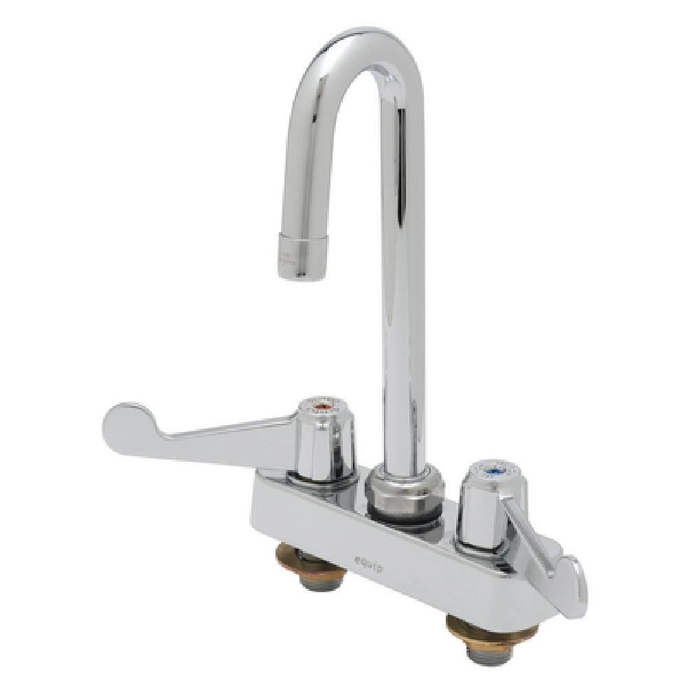 The T&S Brass 5F-4CWX05 Equip Workboard Faucet is a highly functional fixture designed to meet a variety of industry needs. With a 4-inch center-to-center deck mount configuration, it is well-suited for workboards and commercial kitchen setups. This faucet features a 5-1/2 inch swivel gooseneck, providing versatile water flow direction and ease of use in busy environments. Its quarter-turn ceramic cartridge ensures durability and smooth operation, reducing the need for frequent maintenance. The faucet is equipped with 4-inch wrist action handles, enhancing accessibility and user comfort, especially in compliance with ADA standards. Additionally, it is constructed to meet low lead requirements, reflecting its commitment to safety and regulatory standards. The T&S Brass 5F-4CWX05 stands out as a reliable choice for professionals seeking a dependable faucet solution that combines ease of use, compliance, and robust functionality in settings such as restaurants, hospitality establishments, and institutional kitchens.