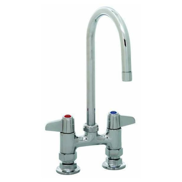 The T&S Brass 5F-4DLS05A Equip Faucet - 4" Deck Mount is a meticulously engineered fixture tailored for diverse industry needs, integrating advanced features for superior functionality. This deck-mounted faucet boasts a 5-1/2" swivel gooseneck, enhancing maneuverability and user convenience. It is crafted with a quarter-turn ceramic cartridge, ensuring long-lasting performance and ease of operation. The faucet includes lever handles, facilitating straightforward and reliable control. A standout feature is its laminar flow device, which, coupled with a 2.2 GPM aerator, ensures a smooth, splash-free water stream, optimizing water usage. The inclusion of 1/2" NPT supply nipples provides robust connectivity, while its low lead composition underscores a commitment to safety and environmental standards. Additionally, the faucet's compliance with ADA regulations highlights its accessibility benefits, making it suitable for various commercial and institutional settings. This T&S Brass faucet is an ideal choice for establishments seeking a durable and efficient water delivery solution, marrying quality with regulatory compliance.