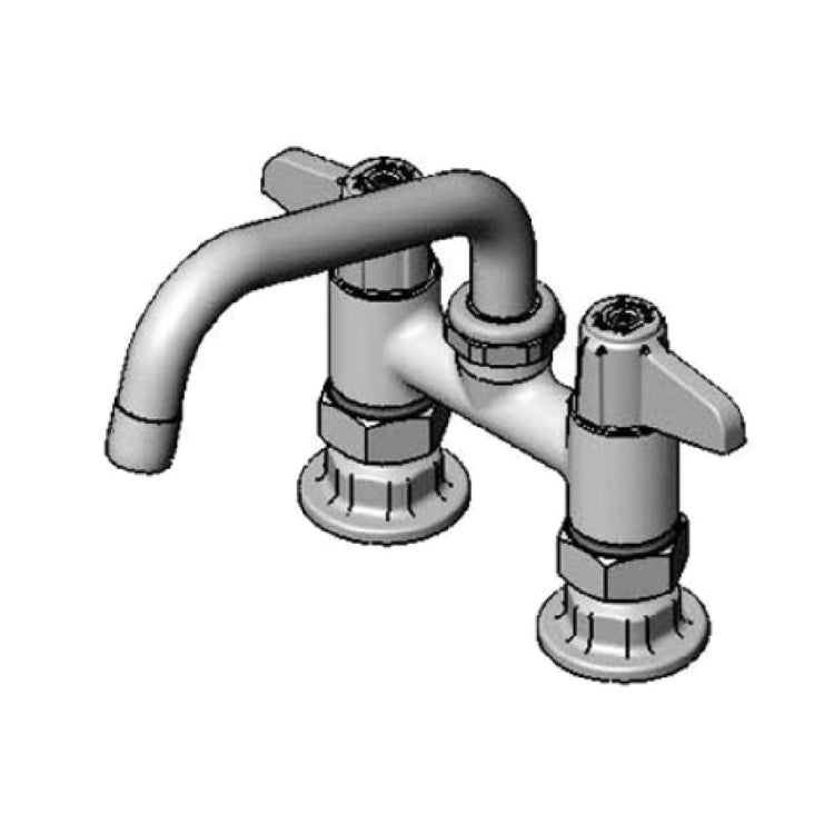 The T&S Brass 5F-4DLS06 Equip Base Faucet stands out as a versatile fixture in commercial settings, particularly for those in the food service and hospitality industries. This deck-mounted faucet features a 4-inch swivel mechanism and a 6-inch swing nozzle, which enhances its functionality by allowing for a broad range of motion and ease of use. It is equipped with quarter-turn ceramic cartridges, ensuring durability and smooth operation over time. The inclusion of lever handles offers intuitive control, while the laminar flow device ensures a steady, splash-free water stream, promoting efficiency and cleanliness. This faucet comes complete with a supply nipple kit and is designed with a 1/2-inch NPT connection, simplifying installation processes. Importantly, it meets low lead requirements, aligning with health and safety standards. Additionally, it is ADA Compliant, highlighting its accessibility and ease of use for all individuals. This combination of features and compliance with industry standards makes the T&S Brass 5F-4DLS06 Equip Base Faucet an ideal choice for establishments seeking a reliable, high-performance faucet that meets both operational and regulatory needs.