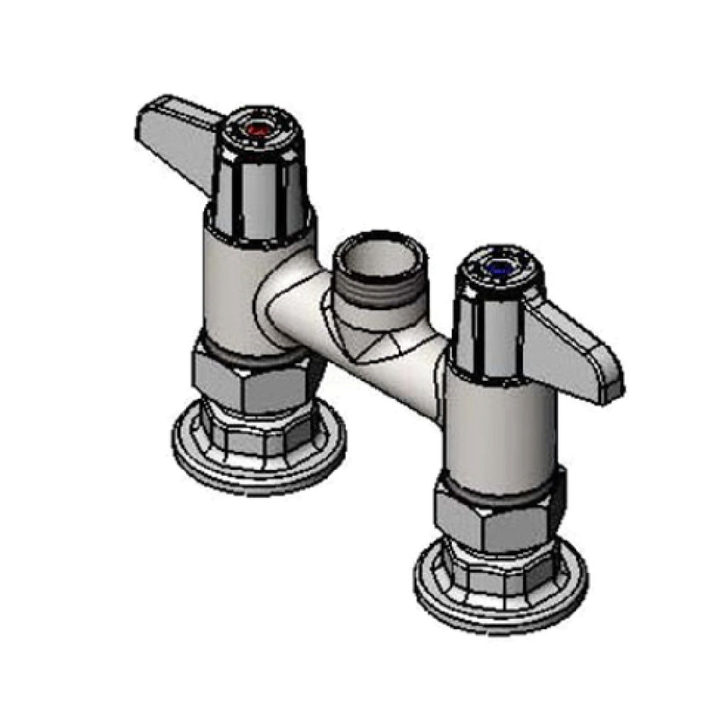 The T&S Brass 5F-4DLX00 Equip Faucet - 4" Deck Mount is a versatile and efficient fixture designed for various commercial settings where precision and durability are paramount. This model features a 4-inch deck mount installation, providing a stable and secure base ideal for high-traffic environments. Notably, the faucet is designed without a nozzle, allowing for customizable attachment to meet specific operational needs. The inclusion of a swivel base enhances flexibility, facilitating a broad range of motion that enhances user convenience. The quarter turn ceramic cartridge system is a standout feature, offering smooth operation and longevity, significantly reducing maintenance requirements over time. Lever handles provide intuitive and ergonomic control, promoting ease of use in fast-paced kitchen environments. With 1/2" NPT inlets, the fixture ensures robust connectivity to standard plumbing systems. Importantly, this model is low lead compliant, ensuring adherence to stringent safety standards, which is crucial for establishments focused on health and safety. Additionally, the faucet's ADA compliance makes it accessible, catering to a diverse range of users, including those with disabilities. The T&S Brass 5F-4DLX00 is thus an exceptional choice for industries prioritizing reliability, safety, and user-centered design in their operational infrastructure.