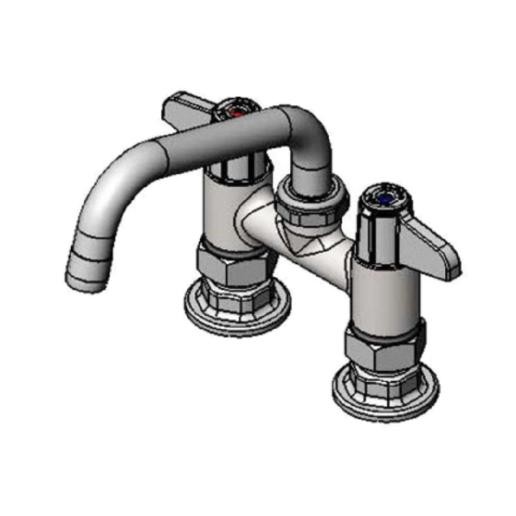 The T&S Brass 5F-4DLX06 Equip Faucet - a versatile fixture designed for efficiency and compliance in commercial and residential settings. This deck mount faucet features a 4-inch structure, ensuring a compact form factor that seamlessly integrates into various environments. It is equipped with a 6-inch swivel nozzle, providing flexibility and ease of use for diverse washing needs. The inclusion of a ceramic cartridge enhances its durability and provides a reliable, drip-free experience, reducing maintenance needs significantly. The lever handles offer intuitive control and are built for smooth operation, accommodating users with different needs, including those with disabilities, as this faucet is ADA Compliant. It incorporates a laminar flow device, promoting a smooth, splash-free water stream, which is crucial for maintaining hygiene and minimizing water wastage. With a 1/2 inch NPT connection, this faucet is easily compatible with standard plumbing configurations. Furthermore, its low lead composition meets stringent safety standards, ensuring that it is suitable for use in environments where water purity is paramount. The T&S Brass 5F-4DLX06 is thus a practical and safe choice for industries requiring robust, compliant, and efficient water dispensing solutions.