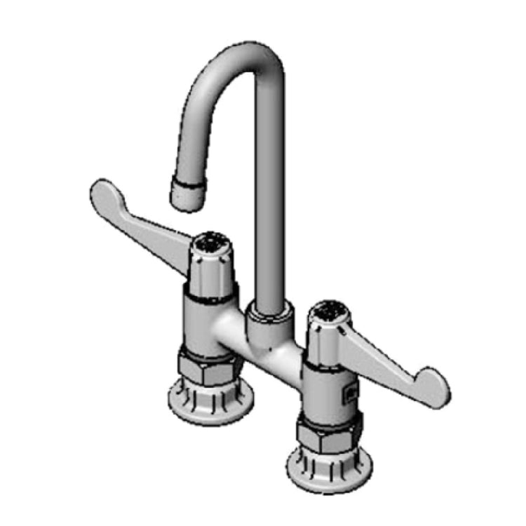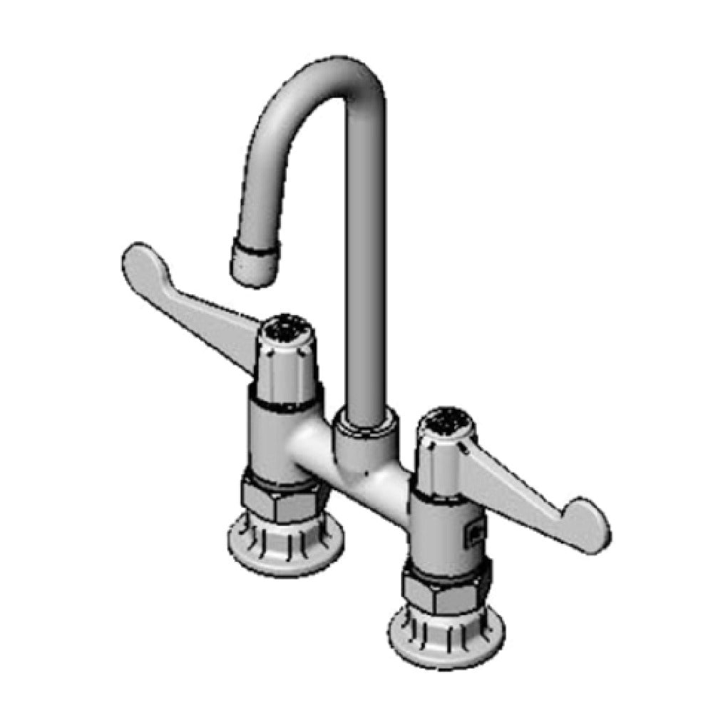 The T&S Brass 5F-4DWS03 Equip Base Faucet 4" Deck Mount is a meticulously engineered plumbing solution featuring a 3-inch rigid gooseneck, designed for durability and reliability in various commercial and institutional settings. This faucet is equipped with a quarter-turn ceramic cartridge, ensuring a smooth and easy operation while minimizing wear and tear. The 4-inch wrist handles provide user-friendly control, accommodating a wide range of users, including those with limited hand mobility, aligning with ADA compliance standards. With a laminar flow device, this faucet delivers a clear, non-splashing stream of water, ideal for environments where hygiene and water efficiency are paramount. It includes a supply nipple kit with a 1/2-inch NPT connection, streamlining installation processes. The T&S Brass 5F-4DWS03 is a low lead-compliant product, meeting stringent safety regulations, making it suitable for facilities adhering to strict health and safety codes. This deck-mounted faucet is designed to integrate seamlessly into existing sink setups, providing a reliable and efficient water delivery system. Its robust construction and user-centric features make it a valuable addition to any professional kitchen, hospital, or laboratory.