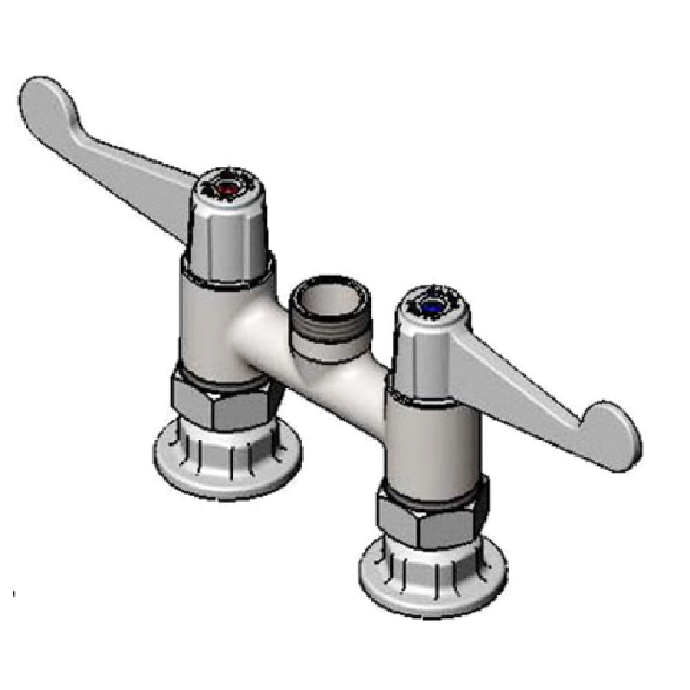 The T&S Brass 5F-4DWX00 Equip Faucet is a precision-engineered plumbing fixture, designed with industry-standard specifications to cater to diverse commercial and residential needs. This swivel faucet boasts a compact 4-inch deck mount design, making it an efficient choice for limited space installations. Engineered with a robust quarter-turn ceramic cartridge, it ensures long-lasting performance and smooth operation. The faucet features 4-inch wrist handles, providing ease of use and accessibility, aligning with ADA compliance standards. This model is crafted with a 1/2-inch NPT connection, ensuring compatibility with existing plumbing systems. Notably, it is built as a low lead certified product, reflecting a commitment to environmental and health standards. Although this model is offered less nozzle, it allows for customization to fit specific application requirements. With its blend of durability, efficiency, and compliance, the T&S Brass 5F-4DWX00 Equip Faucet is a practical addition to any plumbing setup, providing high functionality and reliability for various market segments, including hospitality, healthcare, and food service industries.