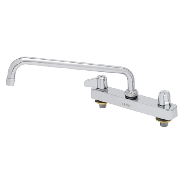 The T&S Brass 5F-8CLX12 Equip Workboard Faucet is a sophisticated plumbing fixture designed for versatility and efficiency. This faucet is a deck-mounted unit, featuring a swivel design with an 8-inch reach, making it an ideal choice for various commercial kitchen settings that require flexibility and ease of use. Its standout feature is the 12-inch swing nozzle, providing ample reach and maneuverability for comprehensive coverage across a workboard. The faucet is equipped with a durable ceramic cartridge, ensuring longevity and smooth operation over time. Lever handles offer easy operation, while the 1/2-inch NPT male inlets ensure a secure and compatible connection. This model is constructed with low lead materials, aligning with stringent safety standards, and is ADA compliant, making it accessible and user-friendly for all operators. The T&S Brass 5F-8CLX12 Equip Workboard Faucet is a critical component for industries that demand dependable and compliant plumbing solutions, from commercial kitchens to laboratory settings, underscoring its role as a reliable and adaptable fixture suitable for various professional environments.