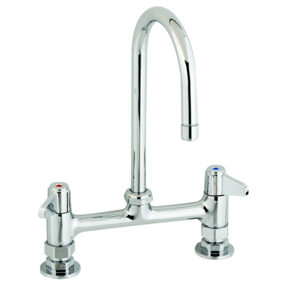The T&S Brass 5F-8DLS05 Equip Faucet Swivel 8" is a deck-mounted fixture designed for precision and efficiency, making it suitable for various professional kitchen environments. It features a 5-1/2" gooseneck, which provides optimal reach and flexibility for different washing tasks, enhancing user convenience. The swivel design allows for easy maneuvering, ensuring that water can be directed exactly where needed. This faucet incorporates a quarter-turn ceramic cartridge, renowned for its durability and smooth operation, reducing the risk of leaks and providing a long-lasting solution. The inclusion of wrist handles offers ergonomic benefits, making it easier to use, especially in fast-paced settings. Furthermore, this faucet comes with a supply nipple kit and a 1/2" NPT connection, facilitating straightforward installation and compatibility with existing plumbing systems. Importantly, the T&S Brass 5F-8DLS05 is low lead, adhering to safety standards, and is ADA compliant, ensuring accessibility for all users. This faucet stands out as a versatile and reliable choice for businesses in the foodservice industry, combining robust functionality with user-centered design, which is crucial in high-demand environments.