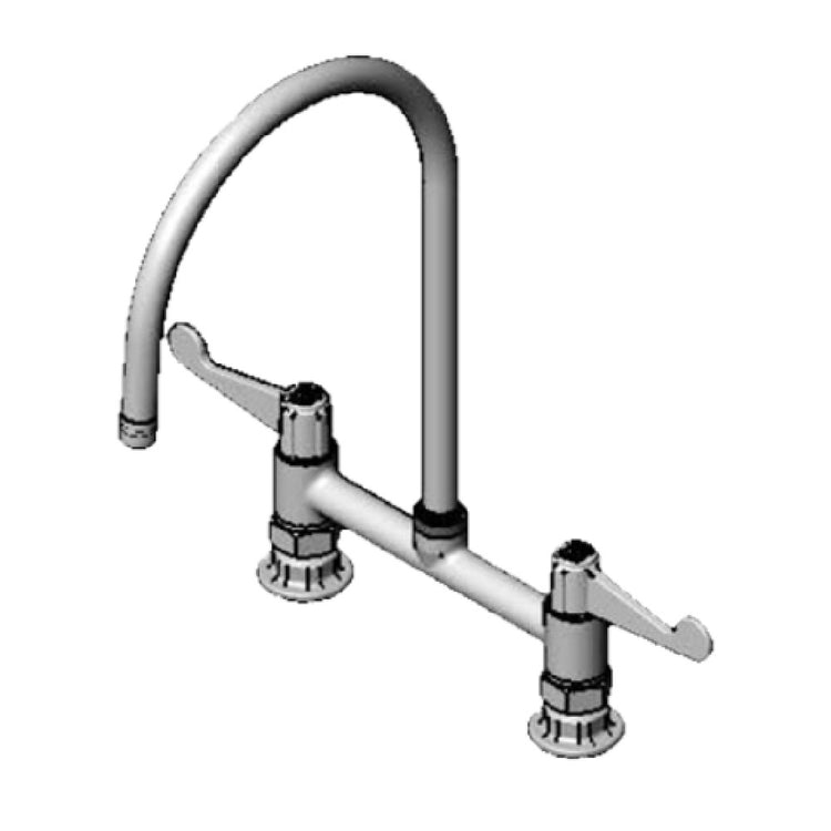 The T&S Brass 5F-8DWS09 Equip Faucet is a highly versatile and efficient solution designed for various industrial applications. This deck mount faucet features a robust 8-inch swivel mechanism and a 9-inch gooseneck, allowing for flexible water delivery tailored to specific needs. Equipped with a quarter-turn ceramic cartridge, it ensures a smooth operation and long-lasting durability, minimizing the need for frequent maintenance. The faucet is complemented by 4-inch wrist handles, making it accessible and user-friendly, especially in environments where ease of use is paramount. A laminar flow device is incorporated, enhancing water quality by reducing turbulence and splashing, which is particularly beneficial in maintaining hygiene standards in food service operations. The faucet also includes a supply nipple kit with a 1/2-inch NPT connection, ensuring ease of installation. Notably, this product is low lead compliant and meets ADA standards, underscoring its commitment to safety and accessibility. The T&S Brass 5F-8DWS09 is engineered to cater to a wide range of market segments, including hospitality, healthcare, and education, providing a reliable and efficient water delivery system that adheres to rigorous industry standards.