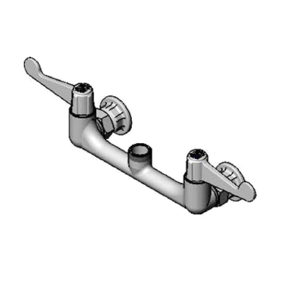 The T&S Brass 5F-8WWX00 Equip Faucet is a versatile and efficient solution designed for wall-mount installations, offering an 8-inch spacing between inlets. This model is crafted without a nozzle, allowing users to customize based on specific needs. Featuring a durable ceramic cartridge, this faucet ensures long-lasting performance and reliability, minimizing maintenance issues commonly associated with traditional rubber or plastic cartridges. The 4-inch wrist handles are designed for ease of use, making it ideal for environments where quick and efficient operation is essential, such as commercial kitchens or healthcare facilities. The faucet accommodates 1/2-inch NPT female inlets, providing compatibility with a variety of plumbing systems. Additionally, the T&S Brass 5F-8WWX00 is ADA compliant, ensuring accessibility for all users, which is crucial in settings that prioritize inclusivity and compliance with regulatory standards. This model's robust construction and thoughtful design make it a preferred choice across a range of industries, from hospitality to healthcare, where both functionality and durability are key considerations. Its ability to meet the diverse and demanding needs of these segments highlights its unique value proposition in professional applications.