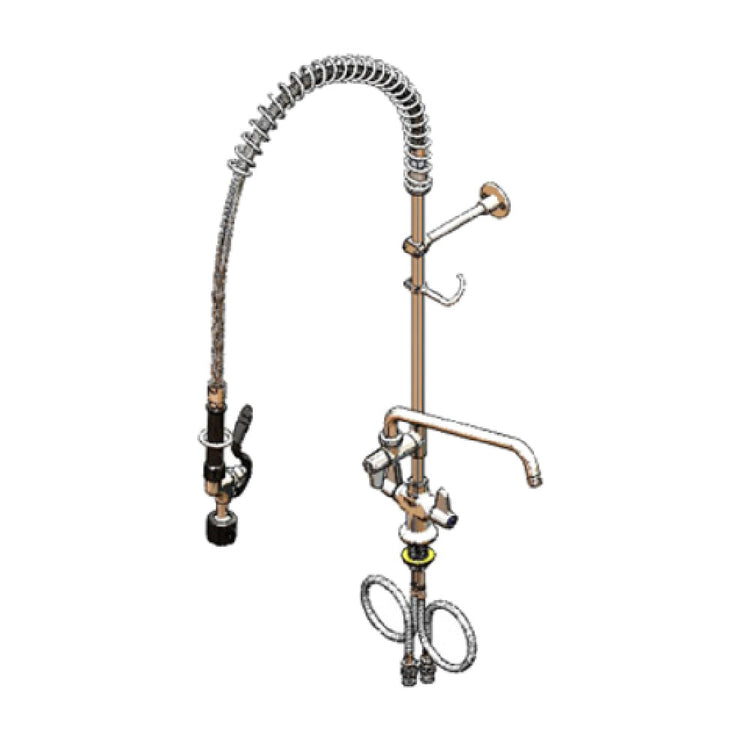 The T&S Brass 5PR-2S12-C Equip Pre-Rinse Unit is a single hole deck mount system, expertly designed to meet the needs of various commercial kitchen environments. This low flow pre-rinse unit is distinguished by its 12-inch swing nozzle, providing flexibility and efficiency in dishwashing tasks. It features an add-on faucet, expanding its utility and making it a versatile choice for establishments prioritizing both space and function. The unit is built with quarter-turn Cerama cartridges, ensuring reliable and long-lasting performance. Additionally, it meets low lead requirements, highlighting its commitment to safety and environmental standards. The design and features of the T&S Brass 5PR-2S12-C make it particularly valuable for restaurants, hotels, and catering businesses that require durable and efficient pre-rinse solutions. Its thoughtful engineering offers significant water savings, aligning with sustainability goals in commercial kitchen operations. The combination of a robust swing nozzle and a convenient add-on faucet makes it adaptable to a variety of tasks, while the low lead construction ensures compliance with health regulations. This pre-rinse unit is a strategic investment for professional kitchens aiming to enhance operational efficiency while adhering to strict environmental and safety standards.