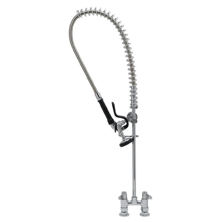 The T&S Brass 5PR-4D00 Equip Pre-Rinse Unit is an expertly engineered fixture designed for efficiency and durability in commercial kitchen settings. Featuring a 4-inch centers deck mount base, this unit is tailored for seamless installation on countertop setups, providing a space-saving and organized solution for dishwashing areas. The inclusion of a 6-inch wall bracket ensures additional stability and support, accommodating frequent usage in high-demand environments. Equipped with advanced ceramic cartridges, this unit promises enhanced durability and reliability, significantly reducing maintenance needs and ensuring a long-lasting performance. Acknowledging safety and environmental considerations, the low lead construction of the T&S Brass 5PR-4D00 complies with strict industry standards, promoting a safer kitchen environment. This pre-rinse unit is an ideal choice for a variety of segment markets, including restaurants, cafeterias, and catering services, where robust and efficient pre-rinse capabilities are crucial. Its combination of cutting-edge technology and quality materials makes it a valuable addition to any professional kitchen, enhancing both functionality and operational efficiency.