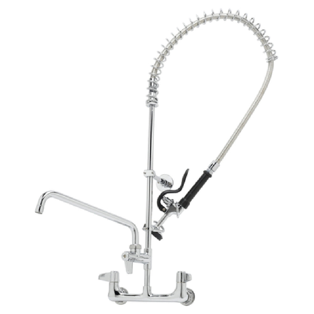 The T&S Brass 5PR-8W10 Equip Pre-Rinse Unit-8" Centers Wall Mount Base is a meticulously engineered fixture designed for efficiency and reliability in commercial kitchen settings. Featuring 8-inch centers for wall mounting, this pre-rinse unit brings robust functionality to any workspace. It includes a 6-inch wall bracket for enhanced stability and a 10-inch add-on faucet that provides versatile water supply options. The unit is equipped with quarter-turn Cerama cartridges, which ensure smooth operation and longevity, reducing the risk of leaks and maintenance needs. A notable feature is its compliance with low lead standards, making it a safe choice for environments focused on health and safety. This unit caters to diverse market segments within the food service industry, offering a blend of durability and ergonomic design that supports demanding kitchen operations. Its construction and components make it an ideal choice for restaurants, cafeterias, and other high-volume establishments seeking reliable and efficient pre-rinse solutions. The T&S Brass 5PR-8W10 Equip Pre-Rinse Unit combines essential features with a focus on quality, making it a distinctive and valuable component for professional kitchens aiming to optimize their dish-washing processes and overall productivity.