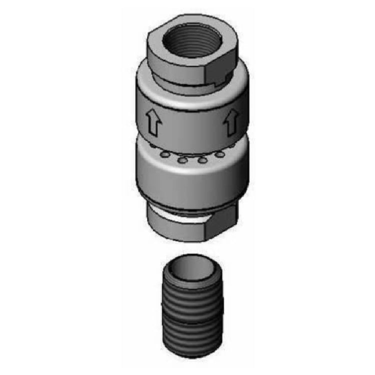 The T&S Brass 5PR-VB Equip Vacuum Breaker is a specialized component designed for plumbing systems, featuring a dual check mechanism to enhance fluid safety and prevent backflow. With a 3/8" NPT inlet and outlet, this vacuum breaker fits seamlessly into systems requiring standardized connections, ensuring compatibility and ease of installation. Additionally, it includes a 3/8" NPT close nipple, further facilitating integration into existing plumbing frameworks. The low lead construction of the 5PR-VB makes it compliant with stringent safety standards, promoting health and safety in environments where water quality is crucial. Certified by NSF and cCSAus, this vacuum breaker meets rigorous industry standards for performance and reliability, making it a preferred choice for a wide range of applications. Whether in commercial kitchens, laboratories, or industrial settings, the T&S Brass 5PR-VB Equip Vacuum Breaker provides a dependable solution for maintaining system integrity and preventing contamination. Its robust design and adherence to industry certifications underscore its suitability for professionals seeking high-quality, compliant plumbing components.