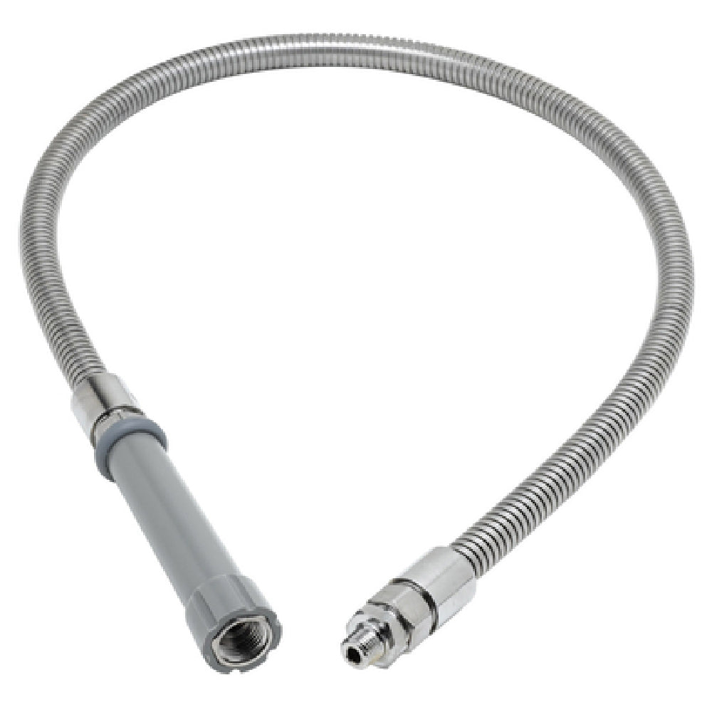 The T&S Brass B-0044-HF Hose 44" Flexible With Fisher Adapter is a high-quality, versatile component designed for various industrial applications requiring reliable water delivery systems. Featuring a flexible 44-inch hose length, it offers ample reach and adaptability for different setups. The inclusion of a Fisher adapter ensures seamless compatibility with Fisher brand fixtures, enhancing its utility across multiple plumbing contexts. Crafted from durable stainless steel, this hose is engineered for longevity and resistance to wear, corrosion, and temperature fluctuations, making it suitable for rigorous environments. The stainless steel construction not only adds strength but also ensures hygienic water conveyance, crucial for sectors like food service and healthcare. This hose is particularly useful for facilities that necessitate frequent repositioning or adjustments, thanks to its flexibility and robust design. Whether employed in commercial kitchens, laboratories, or other professional settings, the T&S Brass B-0044-HF Hose delivers consistent performance and reliability. Its thoughtful design embodies a commitment to quality and precision, making it a reliable choice for professionals who require dependable and efficient water delivery solutions. This product underscores T&S Brass's reputation for engineering excellence and dedication to meeting the diverse needs of its industrial clientele.