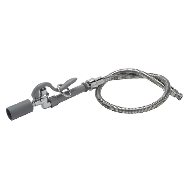 The T&S Brass B-0100-C-SWV Pre-Rinse Spray Low Flow Spray Valve (B-0107-C) is engineered for efficiency and durability, making it an essential component for commercial kitchens and foodservice establishments. This unit features a 44-inch flexible stainless steel hose, providing extended reach and flexibility for thorough pre-rinsing tasks. The spray valve is designed with a low flow rate, adhering to the 2019 DOE PRSV - Class II standards, ensuring water conservation without compromising performance. Its pre-rinse swivel function enhances maneuverability, allowing users to direct the spray with precision. The grey handle offers ergonomic comfort, facilitating prolonged use with minimal strain. The overall length of the unit is 50 inches, and it connects with a 1/2" IPS male inlet, ensuring compatibility with a variety of plumbing setups. This product is ideally suited for busy kitchens seeking efficient water use, durability, and reliable performance, accommodating operations of varying sizes and demands. The T&S Brass B-0100-C-SWV is a practical choice for those looking to optimize their kitchen's pre-rinsing capabilities while adhering to water efficiency standards.